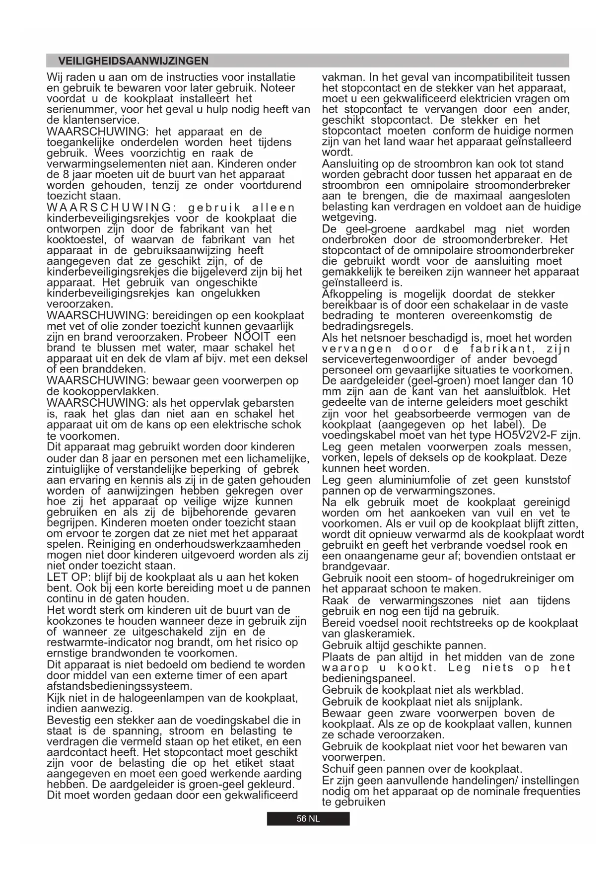 flexibel staal. Belangrijk: controleer nadat u alle installatie handelingen heeft verricht de aansluitpunten op een goede afsluiting. Gebruik hiervoor een zeepsopje. Nooit een vlam. Controleer ook of de flexibele slang niet in aanraking komt met bewegende delen van de keukenmeubelen zoals een lade zodat de slang wordt beschadigd. Let op: als u een gasgeur ruikt die uit het toestel lijkt te komen, schakel dan onmiddellijk de gastoevoer dicht en bel een gekwalificeerde persoon. Ga niet op zoek naar een lek met een vlam. Wanneer die voedingskabel beschadigd is, dient deze vervangen te worden door een erkende reparateur, om onnodige risico's te vermijden. De aarde-draad (groen en geel van kleur) moet ten minste 10 mm langer zijn dan de beide andere draden. De doorsnee van de kabel moet in een goede verhouding staan tot de maximale aansluitwaarde van de kookplaat. Zie voor de netspanningsgegevens het typeplaatje op de kookplaat en controleer of het nieuwe netsnoer van het type H05 V2V2-F is. In het onwaarschijnlijke geval dat een scheur zou verschijnen op het glas, haal onmiddellijk de stekker uit het contact en neem contact op met de klantenservice. Het apparaat is niet bedoeld voor gebruik met een externe timer of afstandsbediening.