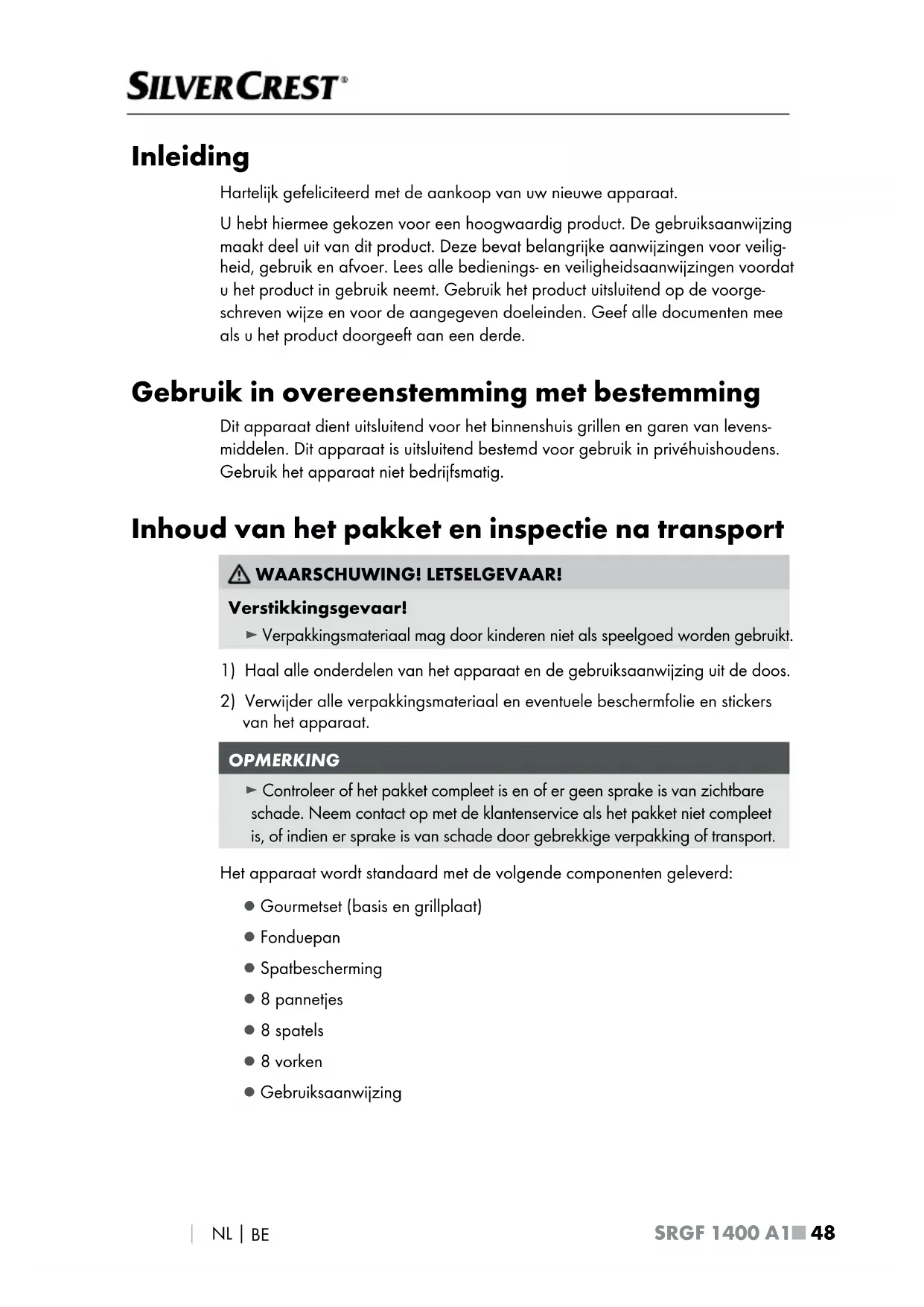 van het apparaat. OPMERKING ► Controleer of het pakket compleet is en of er geen sprake is van zichtbare schade. Neem contact op met de klantenservice als het pakket niet compleet is, of indien er sprake is van schade door gebrekkige verpakking of transport. Het apparaat wordt standaard met de volgende componenten geleverd: ▯ Gourmetset (basis en grillplaat) ▯ Fonduepan ▯ Spatbescherming ▯ 8 pannetjes ▯ 8 spatels ▯ 8 vorken ▯ GebruiksaanwijzingSRGF 1400 A1 NL