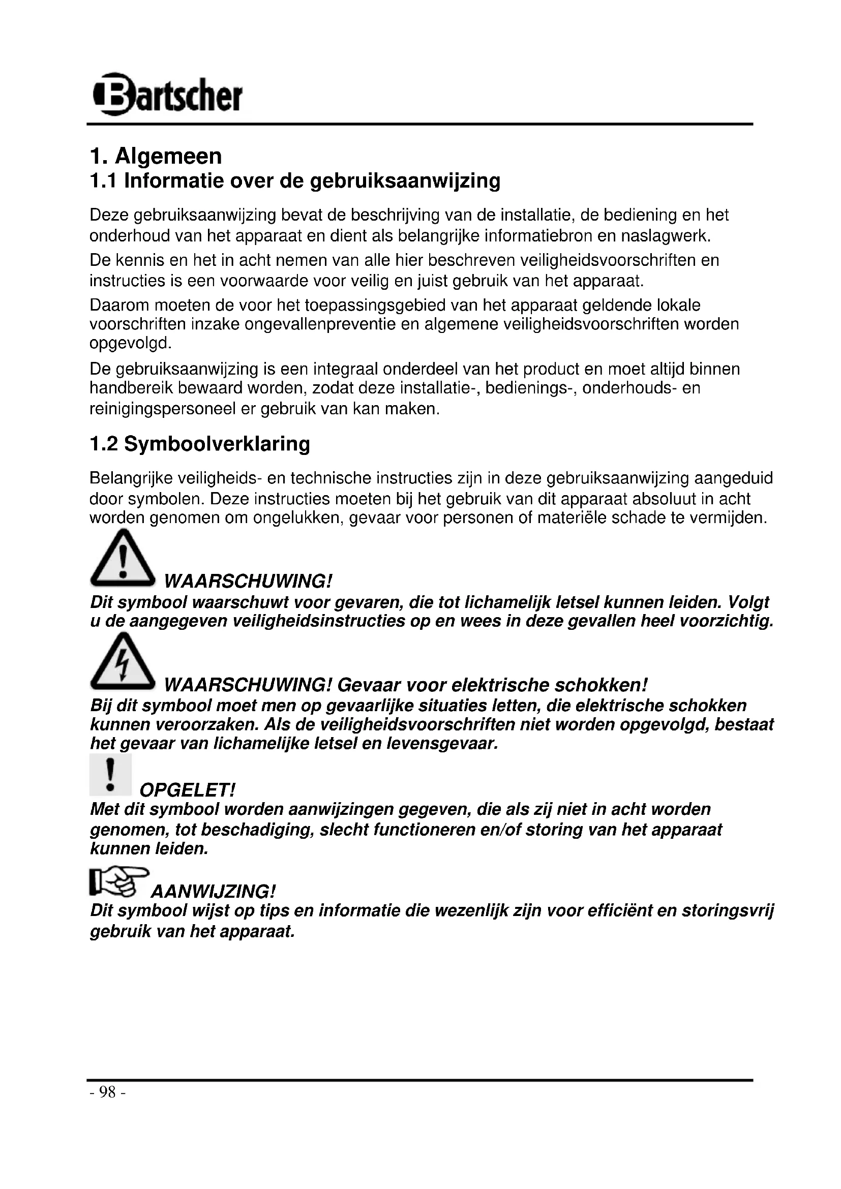 1.1 Informatie over de gebruiksaanwijzing 98