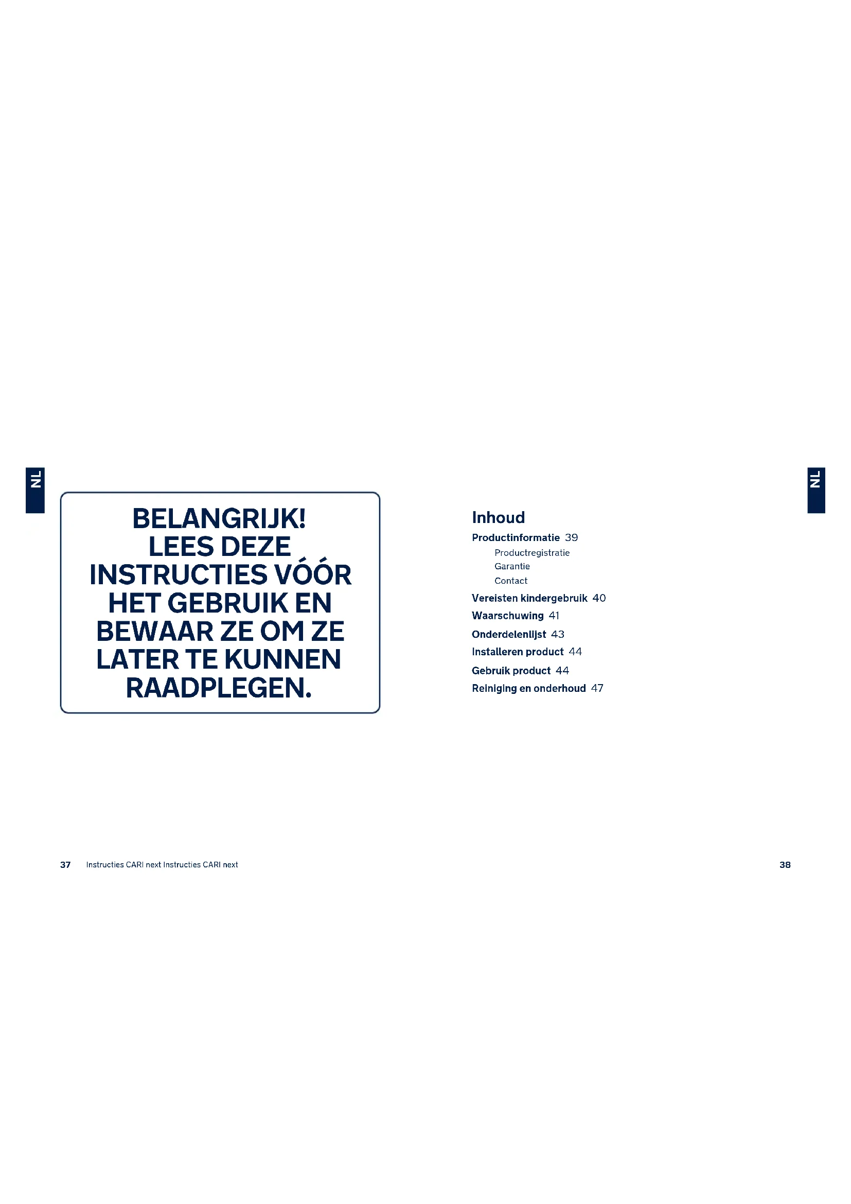 Instructies CARI next Instructies CARI next Inhoud Productinformatie 39 Productregistratie Garantie Contact Vereisten kindergebruik 40 Waarschuwing 41 Onderdelenlijst 43 Installeren product 44 Gebruik product 44 Reiniging en onderhoud 47 BELANGRIJK﹗ LEES DEZE