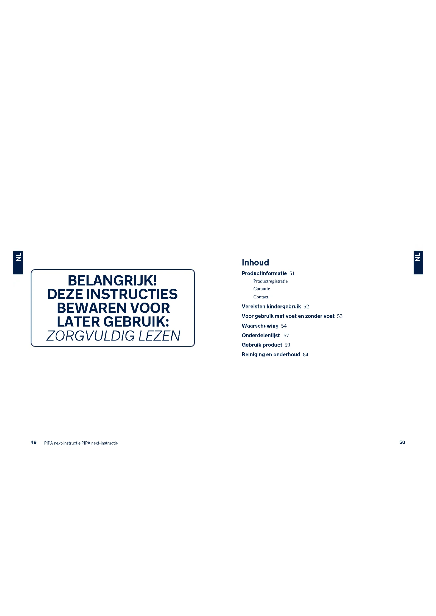DEBELANGRIJK! DEZE INSTRUCTIES BEWAREN VOOR LATER GEBRUIK: ZORGVULDIG LEZEN Inhoud Productinformatie 51 Productregistratie Garantie Contact Vereisten kindergebruik 52 Voor gebruik met voet en zonder voet 53 Waarschuwing 54 Onderdelenlijst 57 Gebruik product 59 Reiniging en onderhoud 64