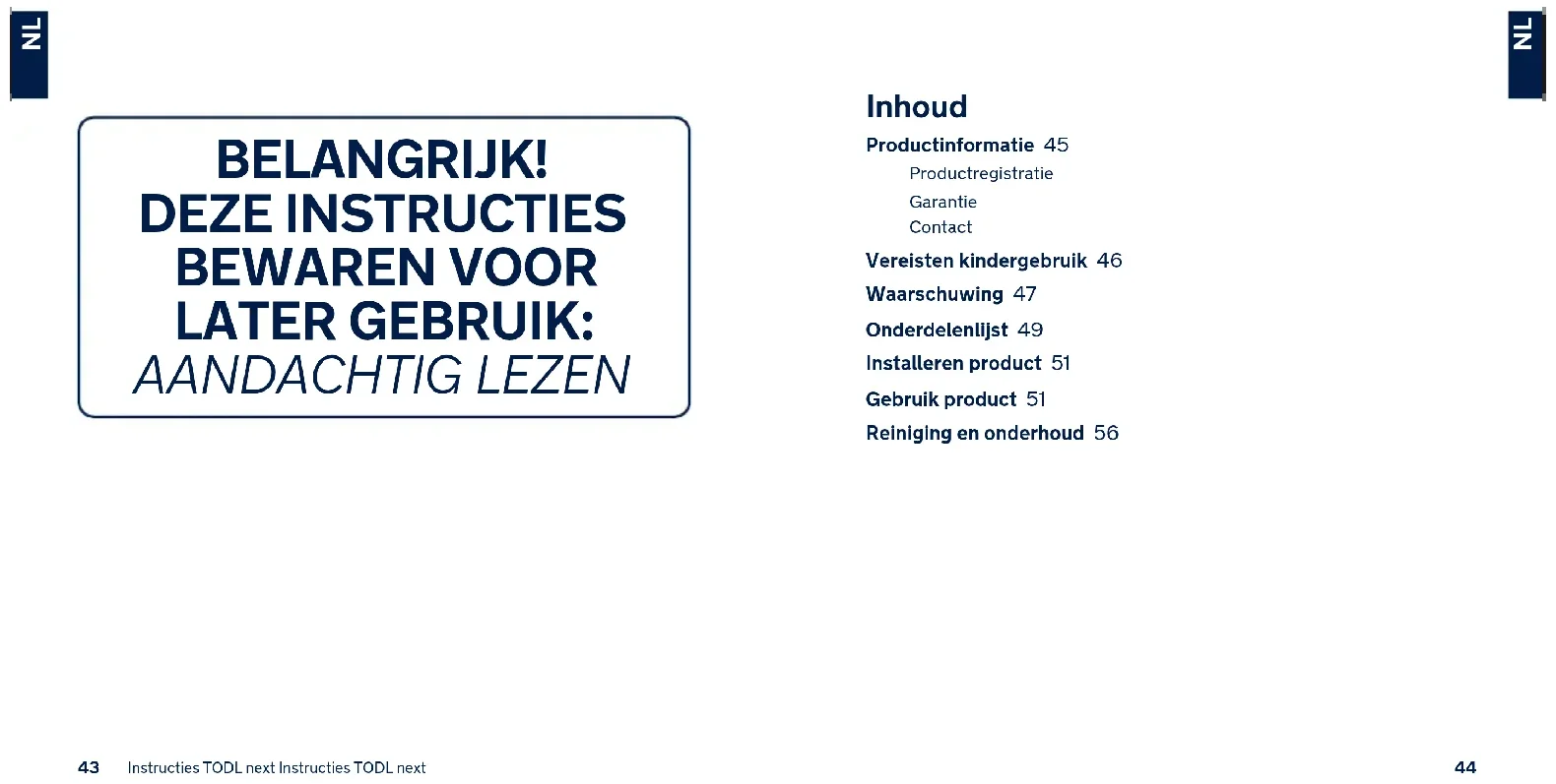 Inhoud Productinformatie 45 Productregistratie Garantie Contact Vereisten kindergebruik 46 Waarschuwing 47 Onderdelenlijst 49 Installeren product 51 Gebruik product 51 Reiniging en onderhoud 56 BELANGRIJK! DEZE INSTRUCTIES BEWAREN VOOR LATER GEBRUIK: AANDACHTIG LEZEN4645 Instructies TODL next Instructies TODL next