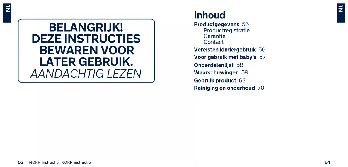 DEBELANGRIJK! DEZE INSTRUCTIES BEWAREN VOOR LATER GEBRUIK. AANDACHTIG LEZEN Inhoud Productgegevens 55 Productregistratie Garantie Contact Vereisten kindergebruik 56 Voor gebruik met baby's 57 Onderdelenlijst 58 Waarschuwingen 59 Gebruik product 63 Reiniging en onderhoud 70