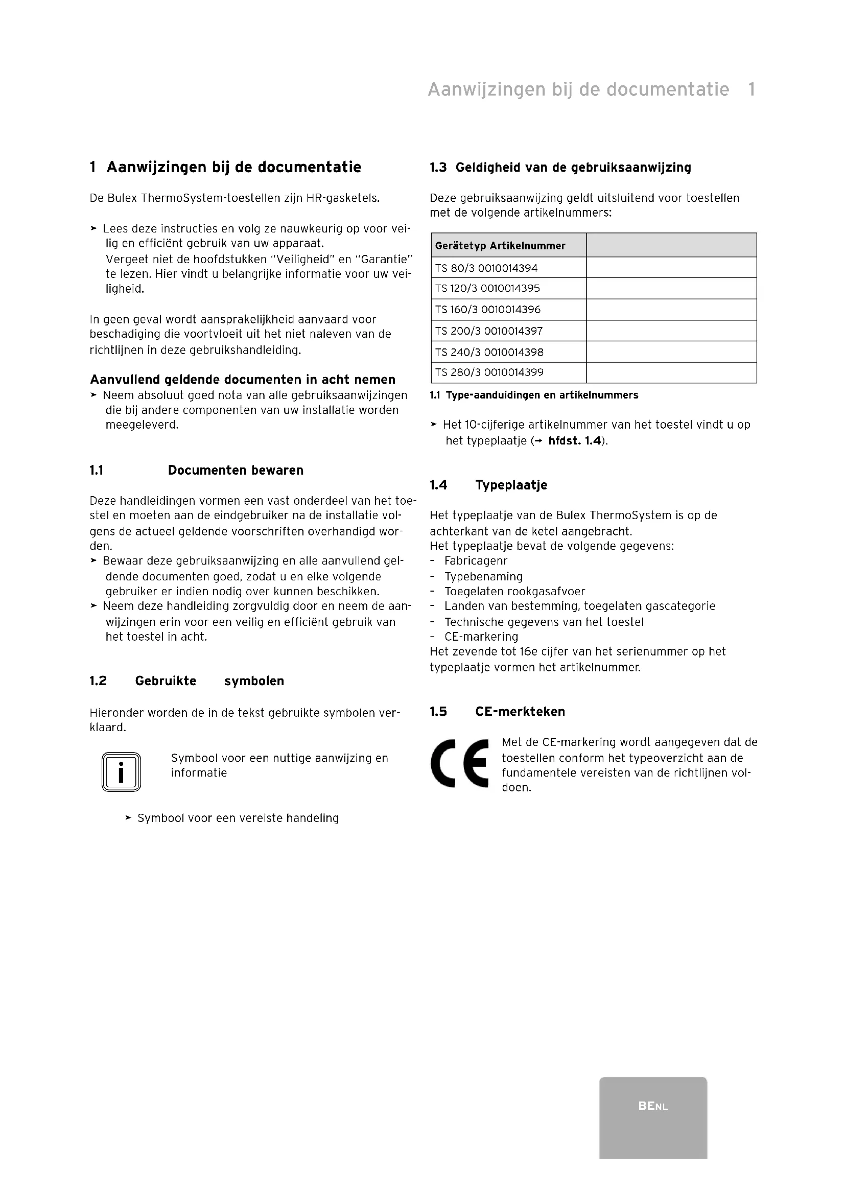 1 Aanwijzingen bij de documentatie De Bulex ThermoSystem-toestellen zijn HR-gasketels.> Lees deze instructies en volg ze nauwkeurig op voor vei-lig en efficiënt gebruik van uw apparaat.Vergeet niet de hoofdstukken “Veiligheid” en “Garantie”te lezen. Hier vindt u belangrijke informatie voor uw vei-ligheid.In geen geval wordt aansprakelijkheid aanvaard voor beschadiging die voortvloeit uit het niet naleven van de richtlijnen in deze gebruikshandleiding. Aanvullend geldende documenten in acht nemen > Neem absoluut goed nota van alle gebruiksaanwijzingendie bij andere componenten van uw installatie worden meegeleverd.