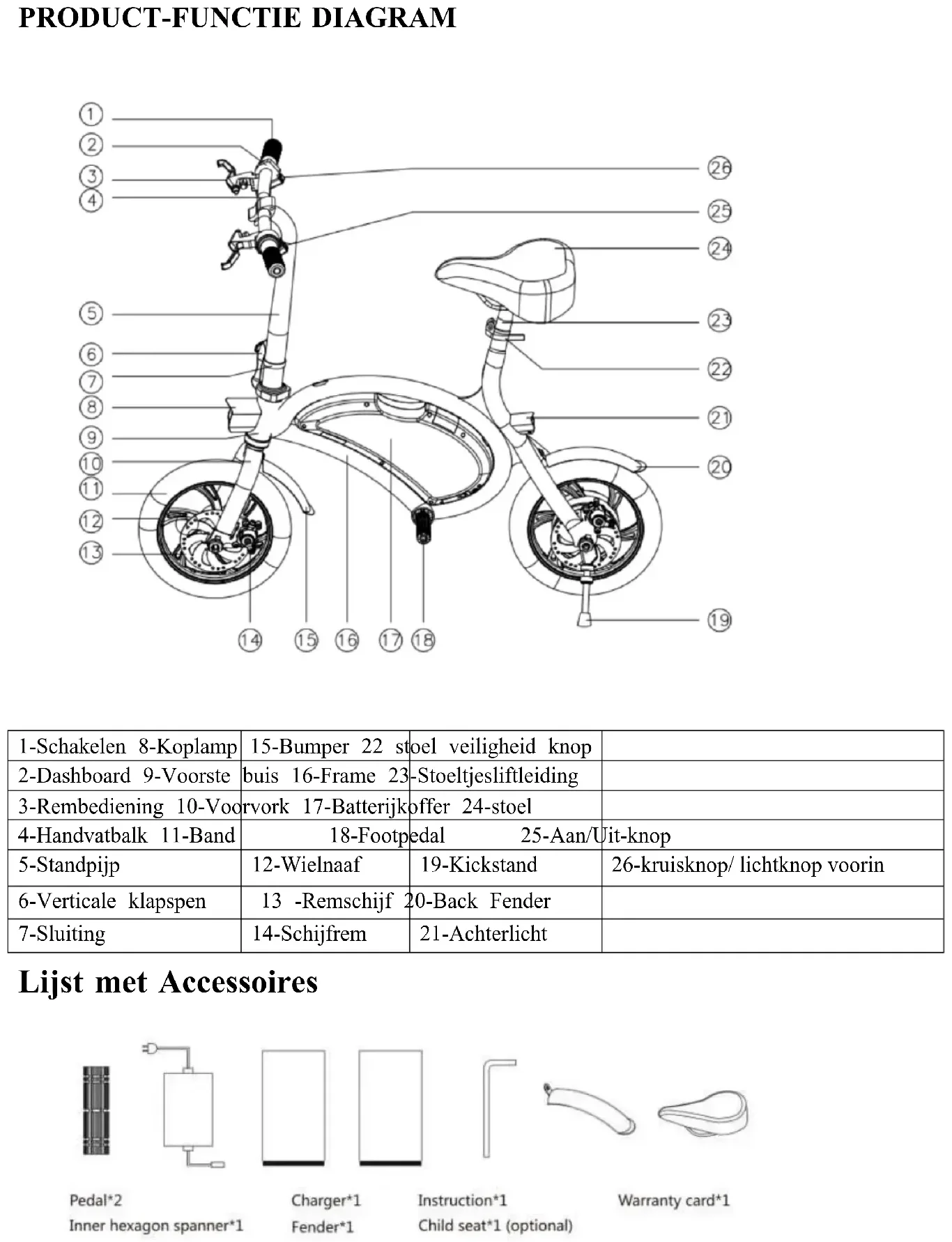 Grootte Materiaal Metaal Vouwgrootte 1020*200*720mm Vrijgegeven groottesizeVrijgegeven 1020*505*940mm Pedaal hoogte 200mm Naafmaat 12inch Pakketgrootte 1050*210*650mm Kleur Zwart Prestatie Gewicht 14kg Maximale belasting 120kg maximale snelheid 20km/h Kilometerstand 20±3km Bergop 15 graden Temperatuur -10~45°C Waterbestendig IP54 Normen Accu 6Ah Nominaal vermogen 250W Nominale spanning 36V Laadspanning DC42V Ingangsspanning AC100-220V Oplaadtijd 4H Kenmerken Cruise Ja Rem modus Schijfrem achter Zitplaats Verstelbaar Mand Optioneel Kinderzitje Optioneel Opmerking: veel factoren zullen van invloed zijn op de maximumsnelheid , zoals vermogen , belasting , bandenspanning , wegomstandigheden , ketting , smeergraad enz. De kilometerstand is gemeten op basis van de temperatuur 25°C , de belasting 60 kg , De snelheid 15-20 km/u , de gladde en harde weg , en van de volledige batterij naar de lege batterij. Het wordt ook onderworpen aan andere factoren , zoals rijgewoonten , temperatuur , belasting , bandendruk , wegomstandigheden, enz.VOORZICHTIGHEID Batterij en Opladen Oplading tussen 0 graden-45 graden, veel tussen -20 graden tot 60 graden, houd de batterij droog. Stop het niet in zuur en alkaliniteit vloeistof. Geen regen, vuur en hitte. Zet de batterij niet positief en negatief verkeerd. Beschadig de batterij niet of gebruik de verkeerde adapter. Reken het niet meer dan 6 uur aan en reken het niet meer dan 2A. Als u de batterij lang niet gebruikt, zet de batterij dan op een droge en koele plaats en laad deze 3 uur om de 2 maanden op. Volg de instructies of de gebruiker is verantwoordelijk voor de gevolgen. Paardrijden Lees eerst de instructie om de prestaties van het product te kennen. Leen het niet aan iemand die het niet kent. Draag een helm als je rijdt. Volg de verkeersregels en rijd niet op de autoweg.Niet op de drukke weg rijden. Bij afdaling of gladde weg moet de snelheid minder dan 15 km/u zijn. Controleer de band vóór het rijden, de bandenspanning moet 35-45PSI zijn. Niet over de motor heen slaan, hou de bijl glad. Niet overbelasten.(Maximale belasting is 120kg) Wees voorzichtig met het toevoegen van afstand wanneer het onder de regenachtige dag en sneeuwdag. Rijden met één hand is verboden. Onderhoud De e-scooter voor-en achterwiel moet in het midden van het frame. Zet de e-scooter op na het rijden op een koele en droge plaats. Controleer de Motor en rem vaak, injecteer de olie niet op de rem. Controleer de e-scooter en schroeven en plaatsen die moeten worden gerepareerd, vaak repareren. Voorgestelde torsie: schroeven 60-80kgf.cm, staafschroeven 175-200kgf.cm, wielschroeven 320-450kgf.cm. Controleer of de band doorboord is en lek lucht, neem contact op met professionele technicus voor reparatie en vervanging.