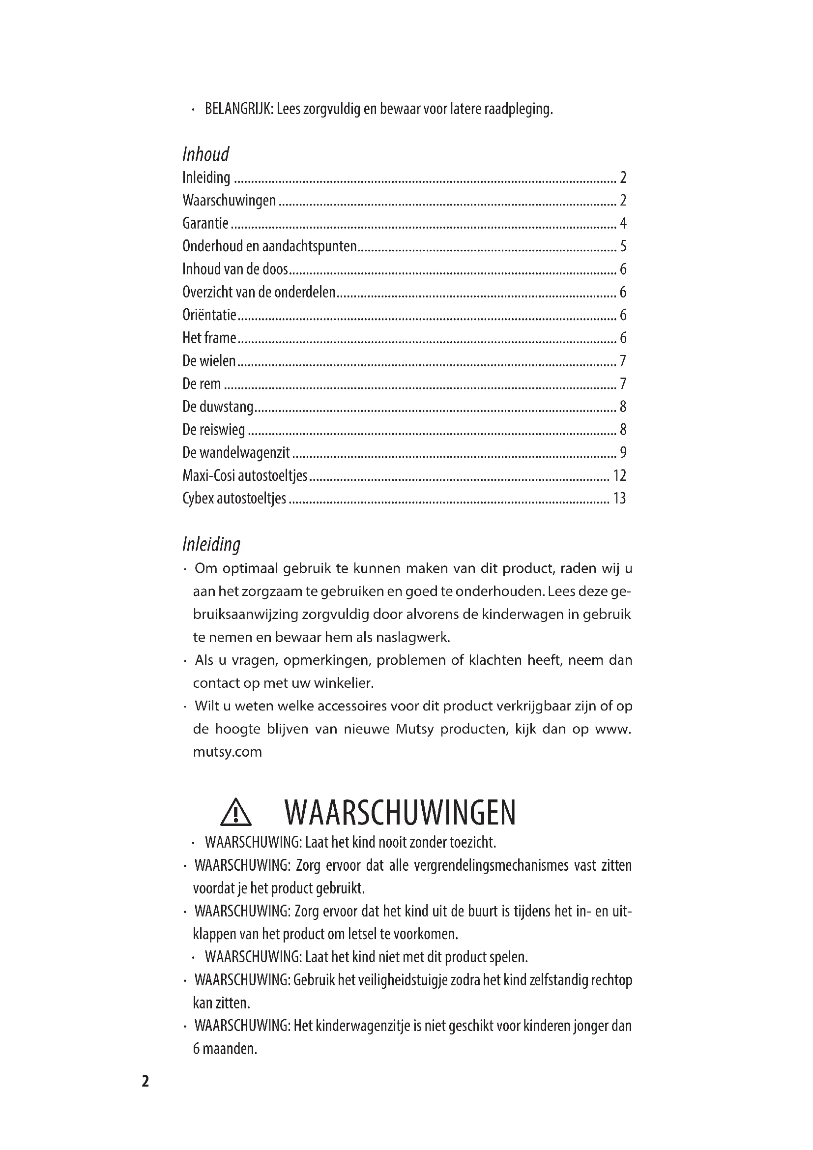- Wilt u weten welke accessoires voor dit product verkrijgbaar zijn of op de hoogte blijven van nieuwe Mutsy producten, kijk dan op www. mutsy.com ⚠ WAARSCHUWINGEN