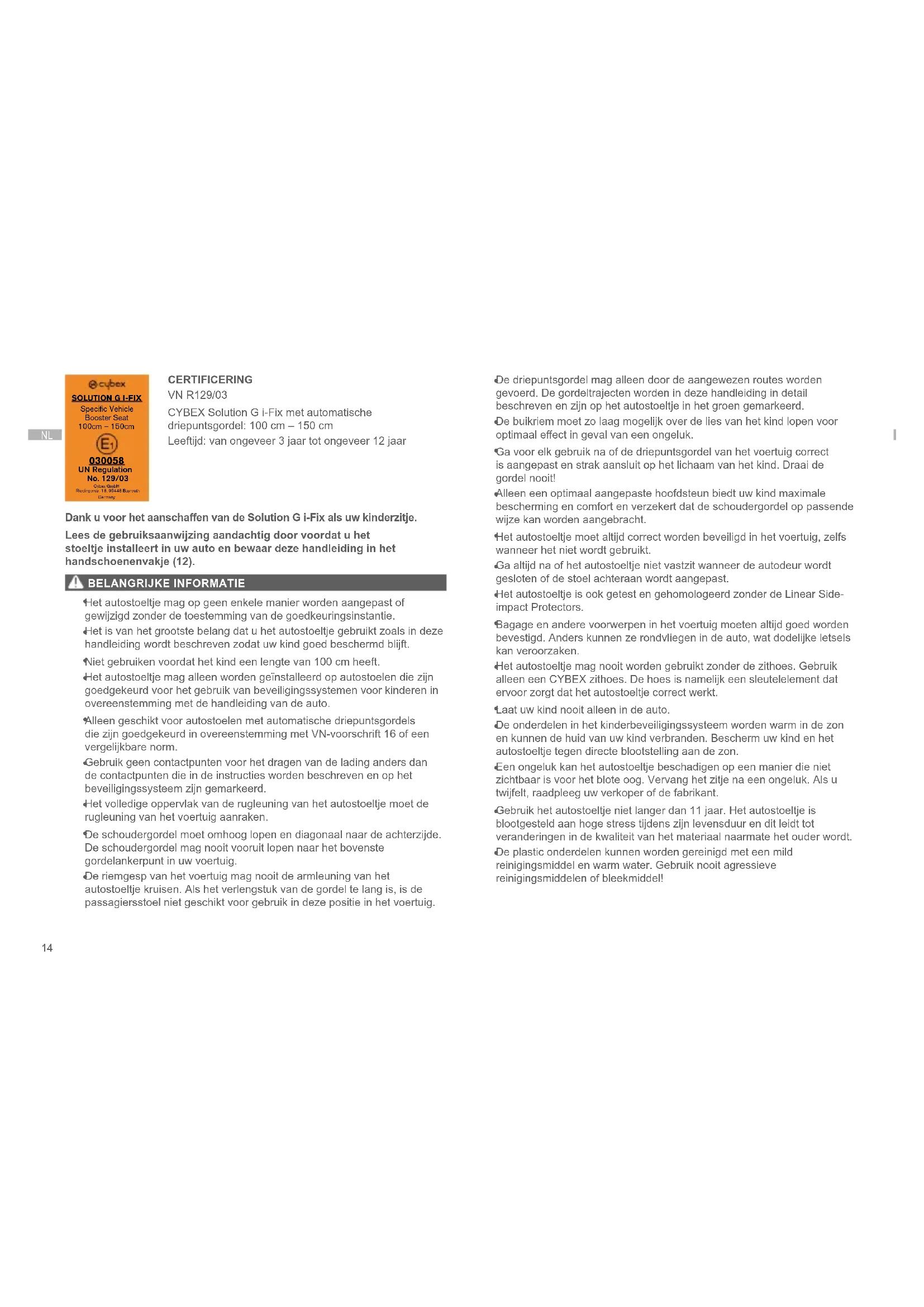 CERTIFICERING VN R129/03 CYBEX Solution G i-Fix met automatische driepuntsgordel: 100 cm – 150 cm Leeftijd: van ongeveer 3 jaar tot ongeveer 12 jaar DankuvoorhetaanschaenvandeSolutionGi-Fixalsuwkinderzitje. Lees de gebruiksaanwijzing aandachtig door voordat u het stoeltje installeert in uw auto en bewaar deze handleiding in het handschoenenvakje (12). BELANGRIJKE INFORMATIE