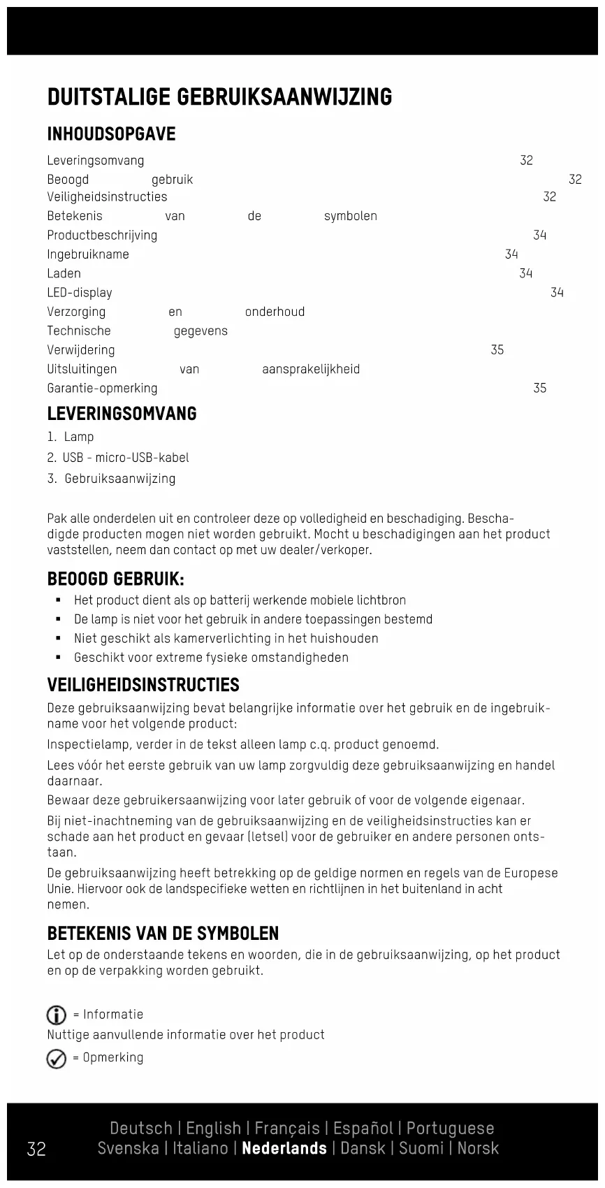 Let op de onderstaande tekens en woorden, die in de gebruiksaanwijzing, op het product en op de verpakking worden gebruikt. = Informatie Nuttige aanvullende informatie over het product = Opmerking Leveringsomvang 32 Beoogd gebruik 32 Veiligheidsinstructies 32 Betekenis van de symbolen 32 Productbeschrijving 34 Ingebruikname 34 Laden 34 LED-display 34 Verzorging en onderhoud 34 Technische gegevens 34 Verwijdering 35 Uitsluitingen van aansprakelijkheid 35 Garantie-opmerking 35 Deutsch | English | Français | Español | Portuguese Svenska | Italiano | Nederlands | Dansk | Suomi | Norsk33 Deutsch | English | Français | Español | Portuguese Svenska | Italiano | Nederlands | Dansk | Suomi | Norsk Deze opmerking waarschuwt voor allerlei mogelijke schade = Waarschuwing Let op – risico! Kan ernstig of fataal letsel veroorzaken DE VEILIGHEIDSINSTRUCTIES IN ACHT NEMEN! Oogletsel voorkomen - nooit rechtstreeks in de lichtstraal kijken of andere personen in het gezicht schijnen. Als dit te lang duurt, kan door de blauwlichtaandelen gevaar voor het netvlies ontstaan. Als een lichtstraal het oog treft, moeten de ogen worden gesloten en moet het hoofd van de lichtstraal worden afgewend. Deze lamp overschrijdt de voorwaarden van risicovrij gebruik. Het risico bij gebruik hangt af van de manier waarop de gebruiker met de lamp omgaat. (1) Met deze waarde wordt de factor aangegeven waarmee de risicogroep-grenswaarde tot de volgende lagere groep wordt overschreden. De grenswaarde ligt bij 1. (2) Afstand van oog tot lamp waarbij de desbetreffende risicogroep van toepassing is. Risicogroep 2 Gevarenwaarde van de blootstelling / Exposure Hazard Value (EHV)(1): 12 Risicogroep Gevarenafstand / Hazard Distance (HD) (2) 2 0 m tot 0.7m 1 0,7m tot 7m Vrije groep > 7 m § Gegevens voor lamp, netadapter en netspanning op het stopcontact moeten met het typeplaatje overeenkomen. § Bij beschadigingen aan de behuizing, stekker, kabel of netadapter het product niet in werking stellen. Neem contact op met de geautoriseerde vakhandel of het servi- ceadres van de producent. § Product niet openen of modificeren! Reparatiewerkzaamheden en vervanging van de accu mogen alleen door de producent of een daardoor aangewezen servicemonteur of een vergelijkbaar gekwalificeerde persoon worden uitgevoerd. § Houd kinderen uit de buurt van het product en de verpakking. Het product is geen speelgoed. Bij kinderen moet erop worden gelet dat ze niet met het product kunnen spelen. § Dit product is niet geschikt voor gebruik door personen (met inbegrip van kinderen) met beperkte lichamelijke, zintuiglijke of mentale vermogens of die te weinig erva- ring en kennis hebben wat betreft de omgang met dit product. Dergelijke personen moeten door een voor hun veiligheid verantwoordelijke toezichthoudende persoon eerst geïnstrueerd of tijdens de bediening van het product in de gaten gehouden worden! § De LED-lamp kan niet worden vervangen; wanneer de levensduur van de LED eindigt, moet de complete lamp worden vervangen. § Alle beschenen voorwerpen moeten minstens 10 cm van de lamp verwijderd zijn! § De lamp mag uitsluitend voor beoogd gebruik worden gebruikt. § Product is niet geschikt om mee te spelen. § Product buiten bereik van kinderen bewaren! § De niet-naleving van de veiligheidsinstructies kan leiden tot schade aan het appa- raat of tot gevaarlijk letsel van personen! § Houd het product altijd droog LET OP: § Het product bevat een niet-vervangbare li-ion-accu. Gooi het product niet in het vuur! Deutsch | English | Français | Español | Portuguese Svenska | Italiano | Nederlands | Dansk | Suomi | Norsk34 § Het product mag uitsluitend in gesloten, droge en grote ruimtes geladen worden, ver van brandbare materialen en vloeistoffen. Niet-naleving kan tot brandwonden en branden leiden. § Nooit een accu openen, pletten, verhitten of in brand zetten. § Het product niet in een omgeving met explosiegevaar en in de regen gebruiken en niet aan overmatige warmte blootstellen. § Het product niet gebruiken, als het beschadigd lijkt te zijn. PRODUCTBESCHRIJVING: