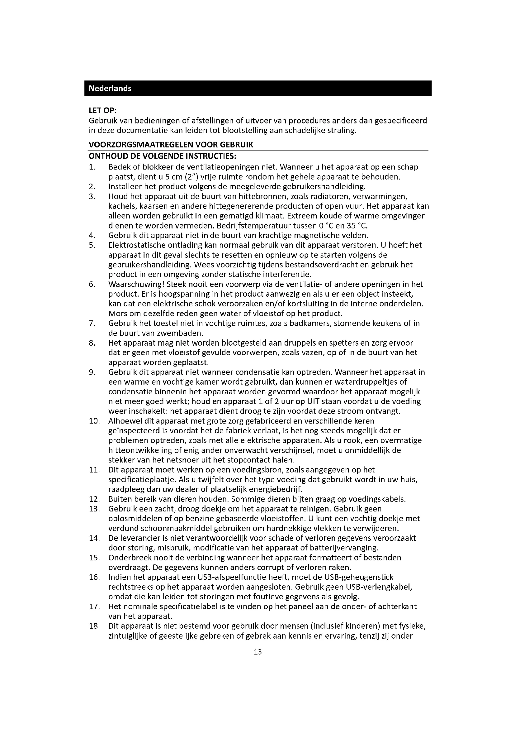 LET OP: Gebruik van bedieningen of afstellingen of uitvoer van procedures anders dan gespecificeerd in deze documentatie kan leiden tot blootstelling aan schadelijke straling.