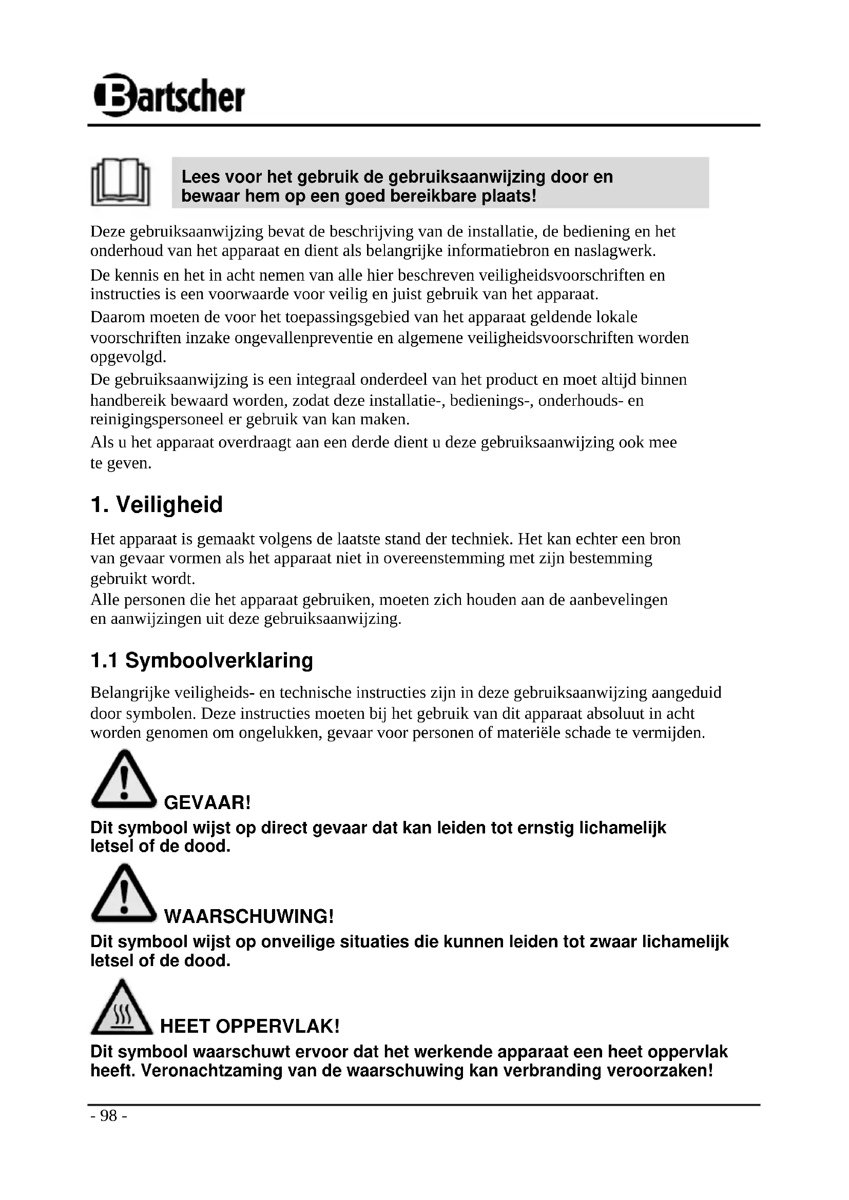 Belangrijke veiligheids- en technische instructies zijn in deze gebruiksaanwijzing aangeduid door symbolen. Deze instructies moeten bij het gebruik van dit apparaat absoluut in acht worden genomen om ongelukken, gevaar voor personen of materiële schade te vermijden. GEVAAR! Dit symbool wijst op direct gevaar dat kan leiden tot ernstig lichamelijk letsel of de dood. WAARSCHUWING! Dit symbool wijst op onveilige situaties die kunnen leiden tot zwaar lichamelijk letsel of de dood. HEET OPPERVLAK! Dit symbool waarschuwt ervoor dat het werkende apparaat een heet oppervlak heeft. Veronachtzaming van de waarschuwing kan verbranding veroorzaken!- 99 - VOORZICHTIG! Dit symbool wijst op de mogelijkheid van het ontstaan van onveilige situaties die kunnen leiden tot lichte verwondingen of beschadiging, storingen in de werking of vernietiging van het apparaat. TIP! Dit symbool wijst op adviezen en informatie waarmee de bediening van het apparaat efficiënt en storingsvrij blijft.