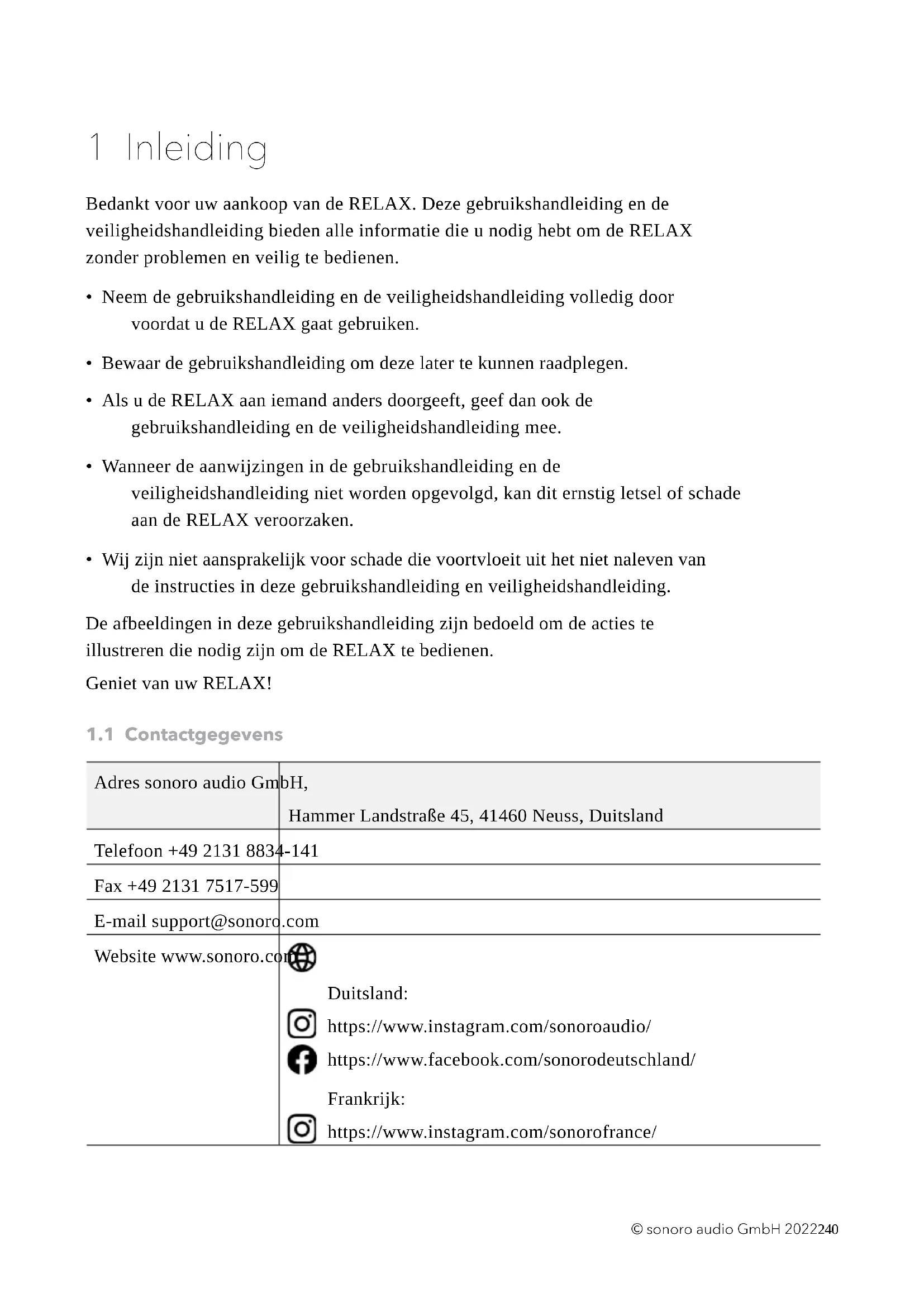 afzonderlijke onderdelen niet beschadigd zijn. Als dit wel het geval is, dan mag u de RELAX niet gebruiken. Neem onmiddellijk met uw dealer of met de klantendienst van sonoro audio GmbH contact op als u schade vaststelt.