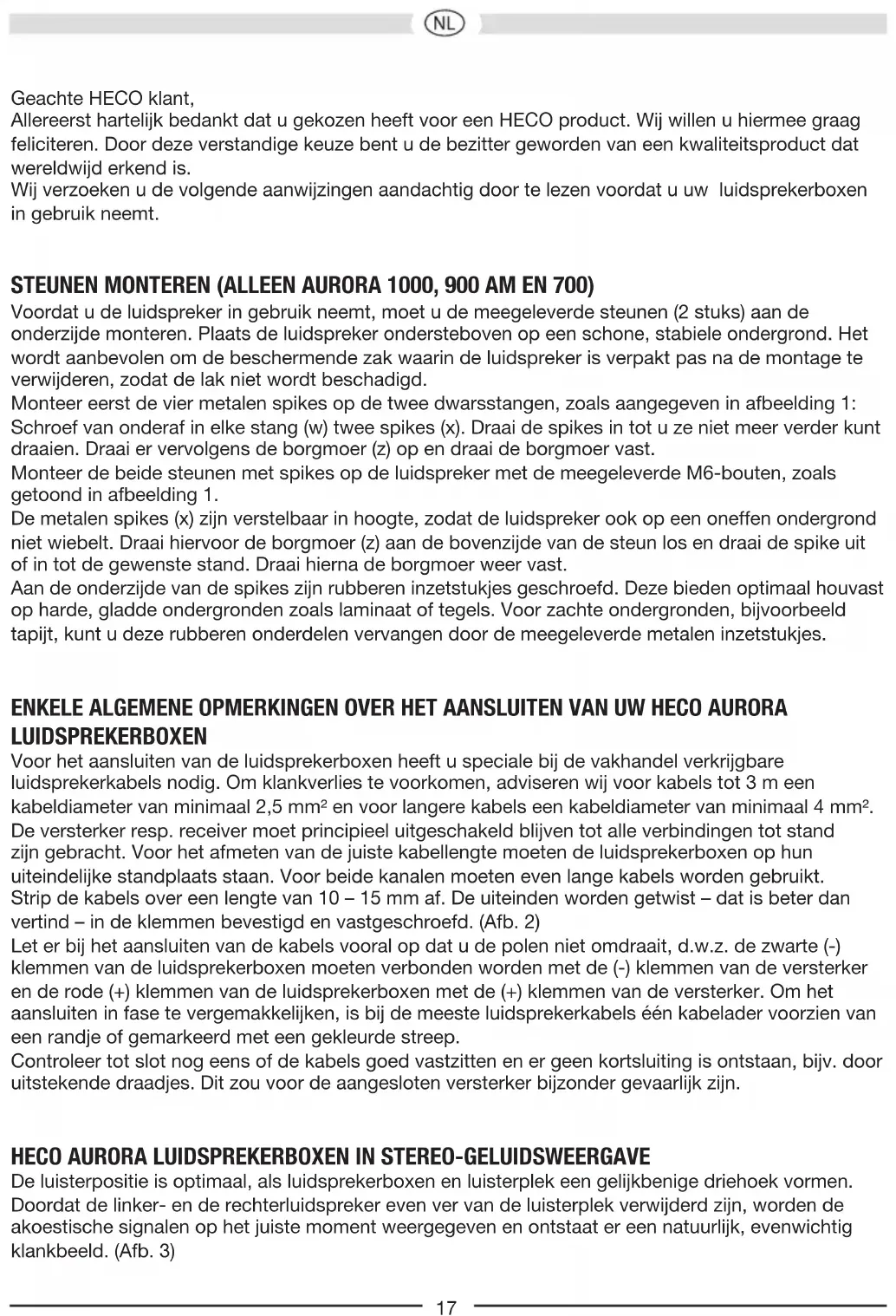 Type: Enceinte bass reflex à 2 voies Enceinte bass reflex à 2 voies Puissance nominale: 65 / 120 W 90 / 150 W Impédance: 4 – 8 Ohm 4 – 8 Ohm Bande passante: 38 – 42 500 Hz 34 – 42 500 Hz Puissance recommandée en sortie de l’amplificateur: 20 – 150 W 20 – 150 W Efficacité (2.8V/1m): 89 dB 90 dB Dimensions (L x H x P): 170 x 308 x 245 mm 490 x 177 x 303 mm Accessoires: Pointes en caoutchouc Pointes en caoutchouc SOUS TOUTES RESERVES DE MODIFICATIONS TECHNIQUESGeachte HECO klant, Allereerst hartelijk bedankt dat u gekozen heeft voor een HECO product. Wij willen u hiermee graag feliciteren. Door deze verstandige keuze bent u de bezitter geworden van een kwaliteitsproduct dat wereldwijd erkend is. Wij verzoeken u de volgende aanwijzingen aandachtig door te lezen voordat u uw luidsprekerboxen in gebruik neemt. STEUNEN MONTEREN (ALLEEN AURORA 1000, 900 AM EN 700) Voordat u de luidspreker in gebruik neemt, moet u de meegeleverde steunen (2 stuks) aan de onderzijde monteren. Plaats de luidspreker ondersteboven op een schone, stabiele ondergrond. Het wordt aanbevolen om de beschermende zak waarin de luidspreker is verpakt pas na de montage te verwijderen, zodat de lak niet wordt beschadigd. Monteer eerst de vier metalen spikes op de twee dwarsstangen, zoals aangegeven in afbeelding 1: Schroef van onderaf in elke stang (w) twee spikes (x). Draai de spikes in tot u ze niet meer verder kunt draaien. Draai er vervolgens de borgmoer (z) op en draai de borgmoer vast. Monteer de beide steunen met spikes op de luidspreker met de meegeleverde M6-bouten, zoals getoond in afbeelding 1. De metalen spikes (x) zijn verstelbaar in hoogte, zodat de luidspreker ook op een oneffen ondergrond niet wiebelt. Draai hiervoor de borgmoer (z) aan de bovenzijde van de steun los en draai de spike uit of in tot de gewenste stand. Draai hierna de borgmoer weer vast. Aan de onderzijde van de spikes zijn rubberen inzetstukjes geschroefd. Deze bieden optimaal houvast op harde, gladde ondergronden zoals laminaat of tegels. Voor zachte ondergronden, bijvoorbeeld tapijt, kunt u deze rubberen onderdelen vervangen door de meegeleverde metalen inzetstukjes. ENKELE ALGEMENE OPMERKINGEN OVER HET AANSLUITEN VAN UW HECO AURORA LUIDSPREKERBOXEN Voor het aansluiten van de luidsprekerboxen heeft u speciale bij de vakhandel verkrijgbare luidsprekerkabels nodig. Om klankverlies te voorkomen, adviseren wij voor kabels tot 3 m een kabeldiameter van minimaal 2,5 mm² en voor langere kabels een kabeldiameter van minimaal 4 mm². De versterker resp. receiver moet principieel uitgeschakeld blijven tot alle verbindingen tot stand zijn gebracht. Voor het afmeten van de juiste kabellengte moeten de luidsprekerboxen op hun uiteindelijke standplaats staan. Voor beide kanalen moeten even lange kabels worden gebruikt. Strip de kabels over een lengte van 10 – 15 mm af. De uiteinden worden getwist – dat is beter dan vertind – in de klemmen bevestigd en vastgeschroefd. (Afb. 2) Let er bij het aansluiten van de kabels vooral op dat u de polen niet omdraait, d.w.z. de zwarte (-) klemmen van de luidsprekerboxen moeten verbonden worden met de (-) klemmen van de versterker en de rode (+) klemmen van de luidsprekerboxen met de (+) klemmen van de versterker. Om het aansluiten in fase te vergemakkelijken, is bij de meeste luidsprekerkabels één kabelader voorzien van een randje of gemarkeerd met een gekleurde streep. Controleer tot slot nog eens of de kabels goed vastzitten en er geen kortsluiting is ontstaan, bijv. door uitstekende draadjes. Dit zou voor de aangesloten versterker bijzonder gevaarlijk zijn.