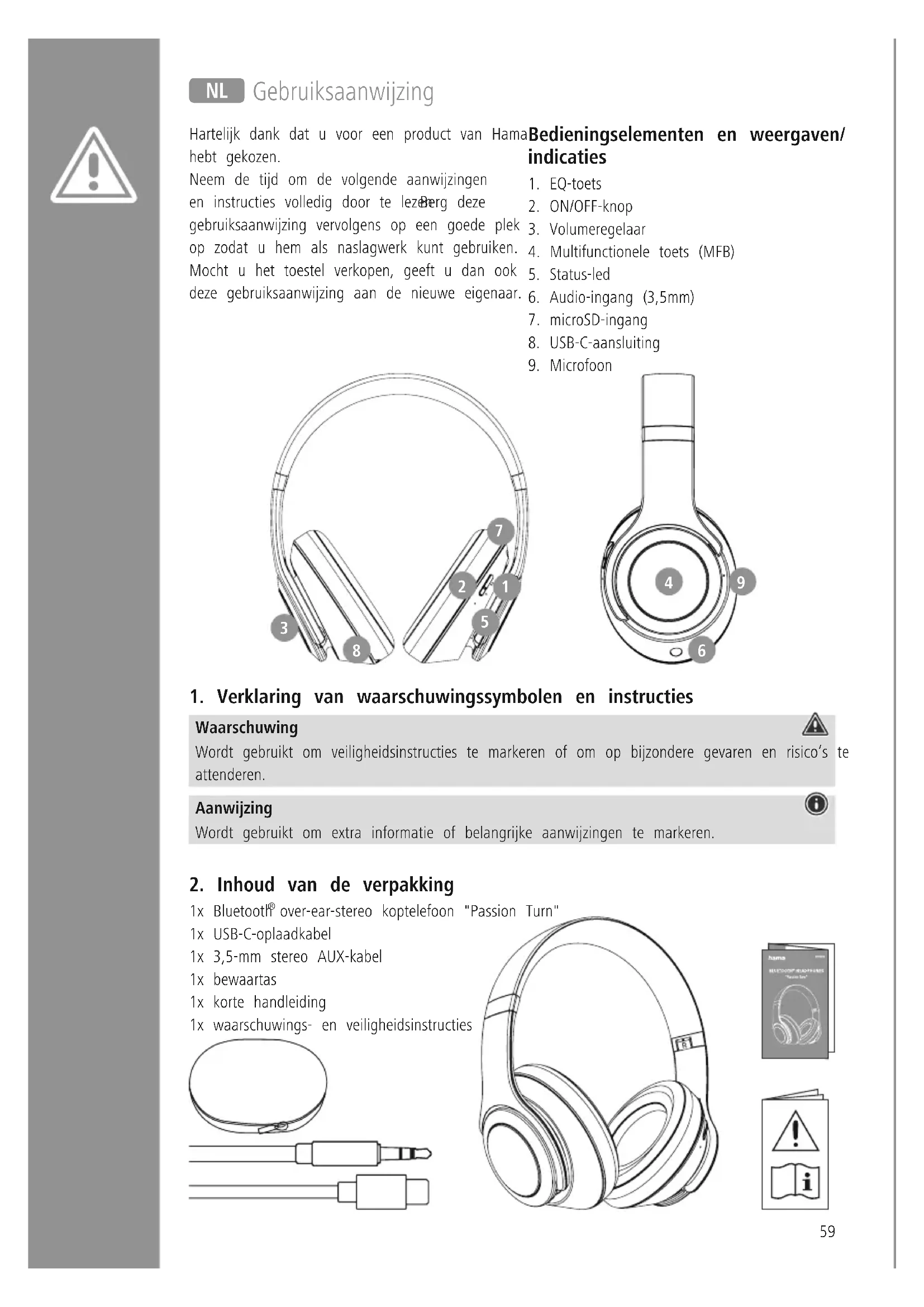 over-ear-stereo koptelefoon "Passion Turn" 1x USB-C-oplaadkabel 1x 3,5-mm stereo AUX-kabel 1x bewaartas 1x korte handleiding 1x waarschuwings- en veiligheidsinstructies
