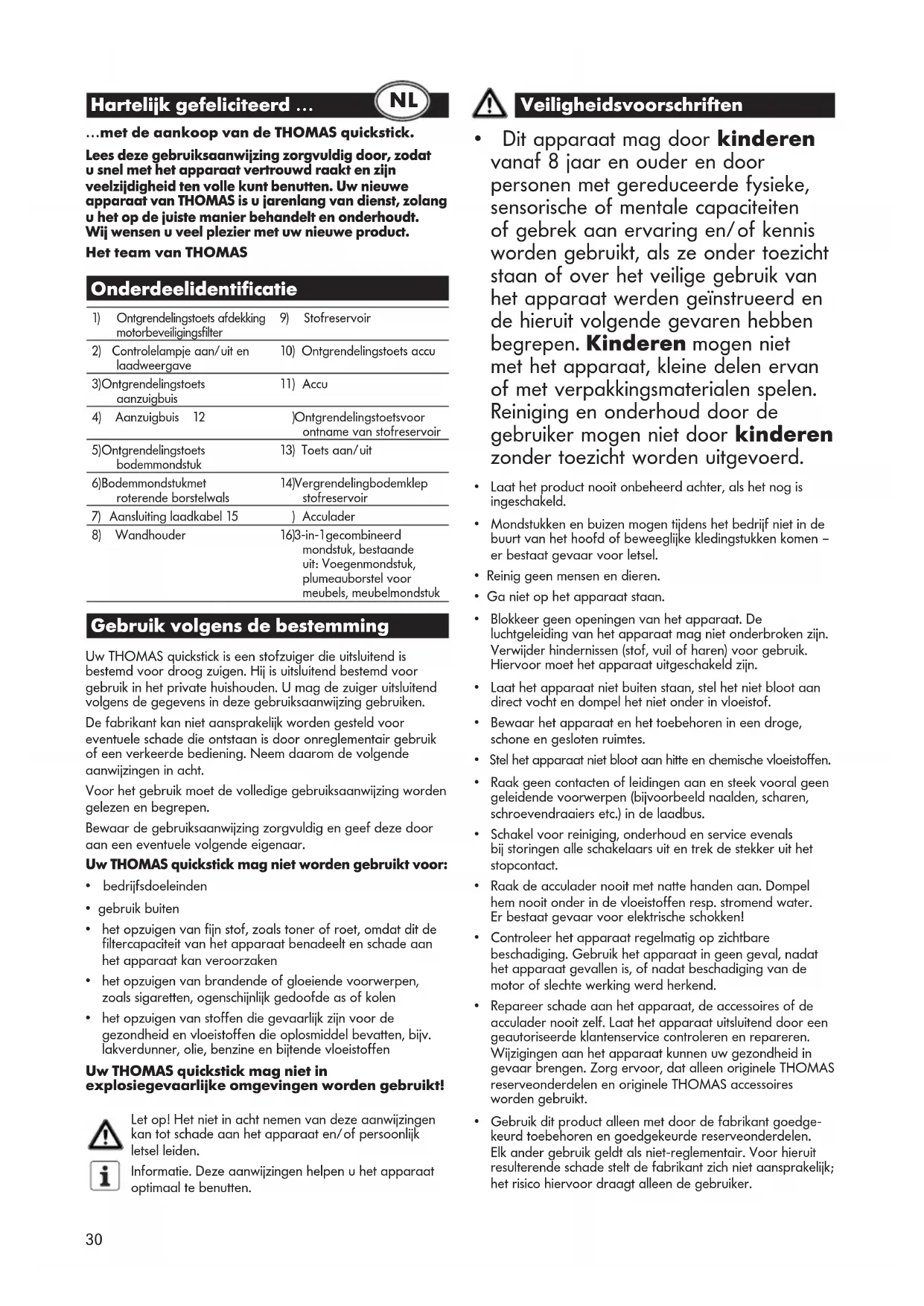 3-in-1 gecombineerd mondstuk, bestaande uit: Voegenmondstuk, plumeauborstel voor meubels, meubelmondstuk Gebruik volgens de bestemming Uw THOMAS quickstick is een stofzuiger die uitsluitend is bestemd voor droog zuigen. Hij is uitsluitend bestemd voor gebruik in het private huishouden. U mag de zuiger uitsluitend volgens de gegevens in deze gebruiksaanwijzing gebruiken. De fabrikant kan niet aansprakelijk worden gesteld voor eventuele schade die ontstaan is door onreglementair gebruik of een verkeerde bediening. Neem daarom de volgende aanwijzingen in acht. Voor het gebruik moet de volledige gebruiksaanwijzing worden gelezen en begrepen. Bewaar de gebruiksaanwijzing zorgvuldig en geef deze door aan een eventuele volgende eigenaar. Uw THOMAS quickstick mag niet worden gebruikt voor: