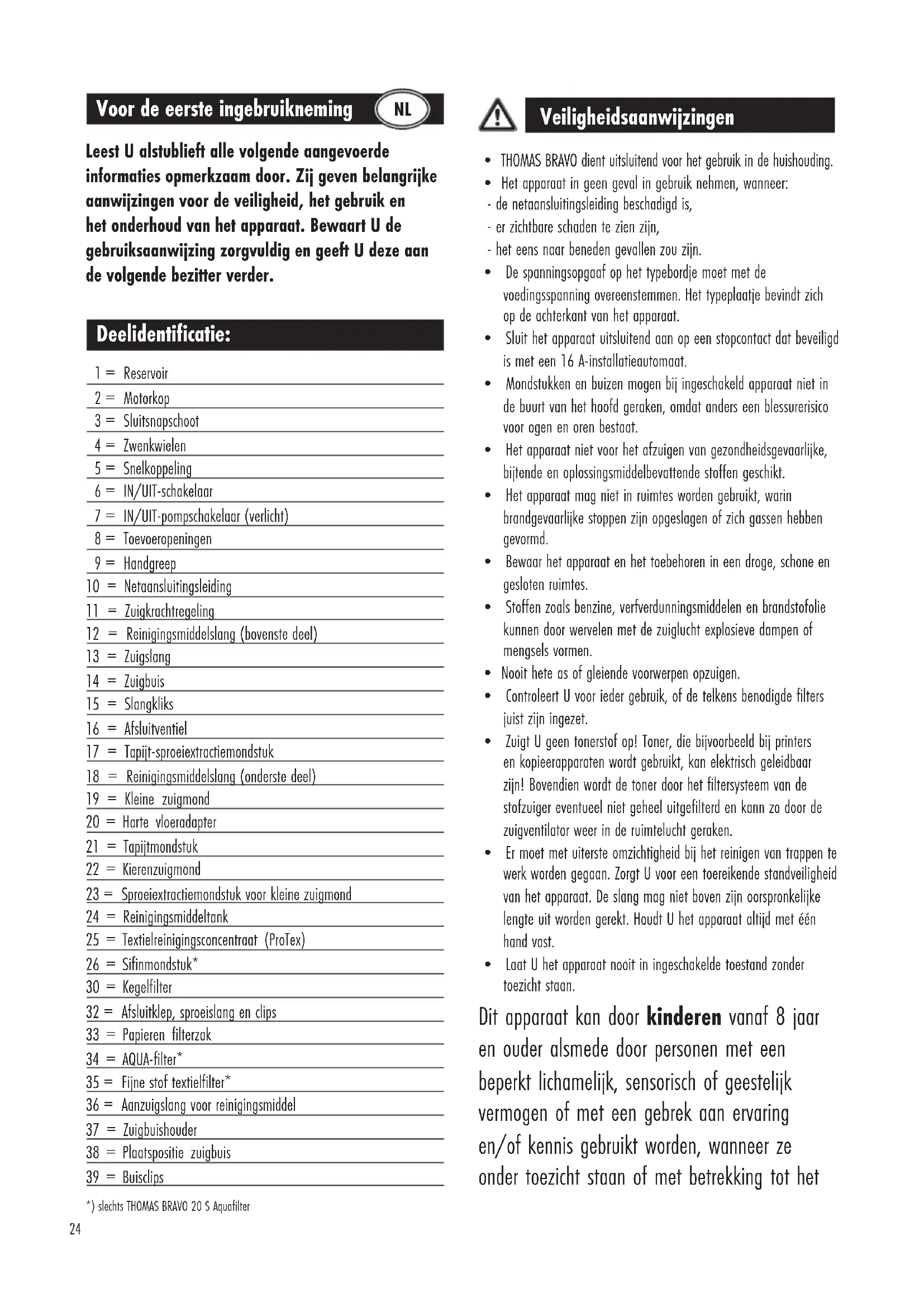 *) slechts THOMAS BRAVO 20 S Aquafilter25 veilige gebruik van het apparaat geïnstrueerd werden en ze de daaruit resulterende gevaren begrepen hebben. Kinderen mogen niet met het apparaat spelen. Reiniging en gebruiksonderhoud mogen niet door kinderen zonder toezicht uitgevoerd worden.