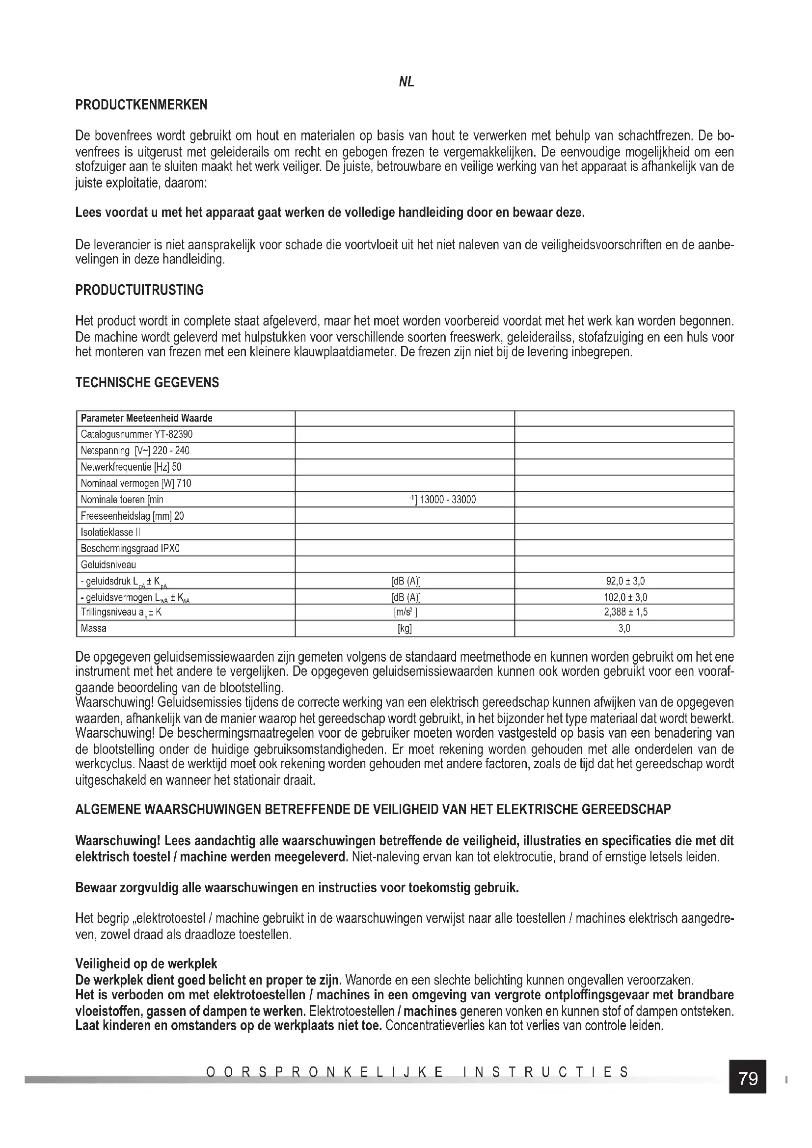OORSPRONKELIJKE INSTRUCTIES PRODUCTKENMERKEN De bovenfrees wordt gebruikt om hout en materialen op basis van hout te verwerken met behulp van schachtfrezen. De bo- venfrees is uitgerust met geleiderails om recht en gebogen frezen te vergemakkelijken. De eenvoudige mogelijkheid om een stofzuiger aan te sluiten maakt het werk veiliger. De juiste, betrouwbare en veilige werking van het apparaat is afhankelijk van de juiste exploitatie, daarom: Lees voordat u met het apparaat gaat werken de volledige handleiding door en bewaar deze. De leverancier is niet aansprakelijk voor schade die voortvloeit uit het niet naleven van de veiligheidsvoorschriften en de aanbe- velingen in deze handleiding. PRODUCTUITRUSTING Het product wordt in complete staat afgeleverd, maar het moet worden voorbereid voordat met het werk kan worden begonnen. De machine wordt geleverd met hulpstukken voor verschillende soorten freeswerk, geleiderailss, stofafzuiging en een huls voor het monteren van frezen met een kleinere klauwplaatdiameter. De frezen zijn niet bij de levering inbegrepen. TECHNISCHE GEGEVENS Parameter Meeteenheid Waarde Catalogusnummer YT-82390 Netspanning [V~] 220 - 240 Netwerkfrequentie [Hz] 50 Nominaal vermogen [W] 710 Nominale toeren [min