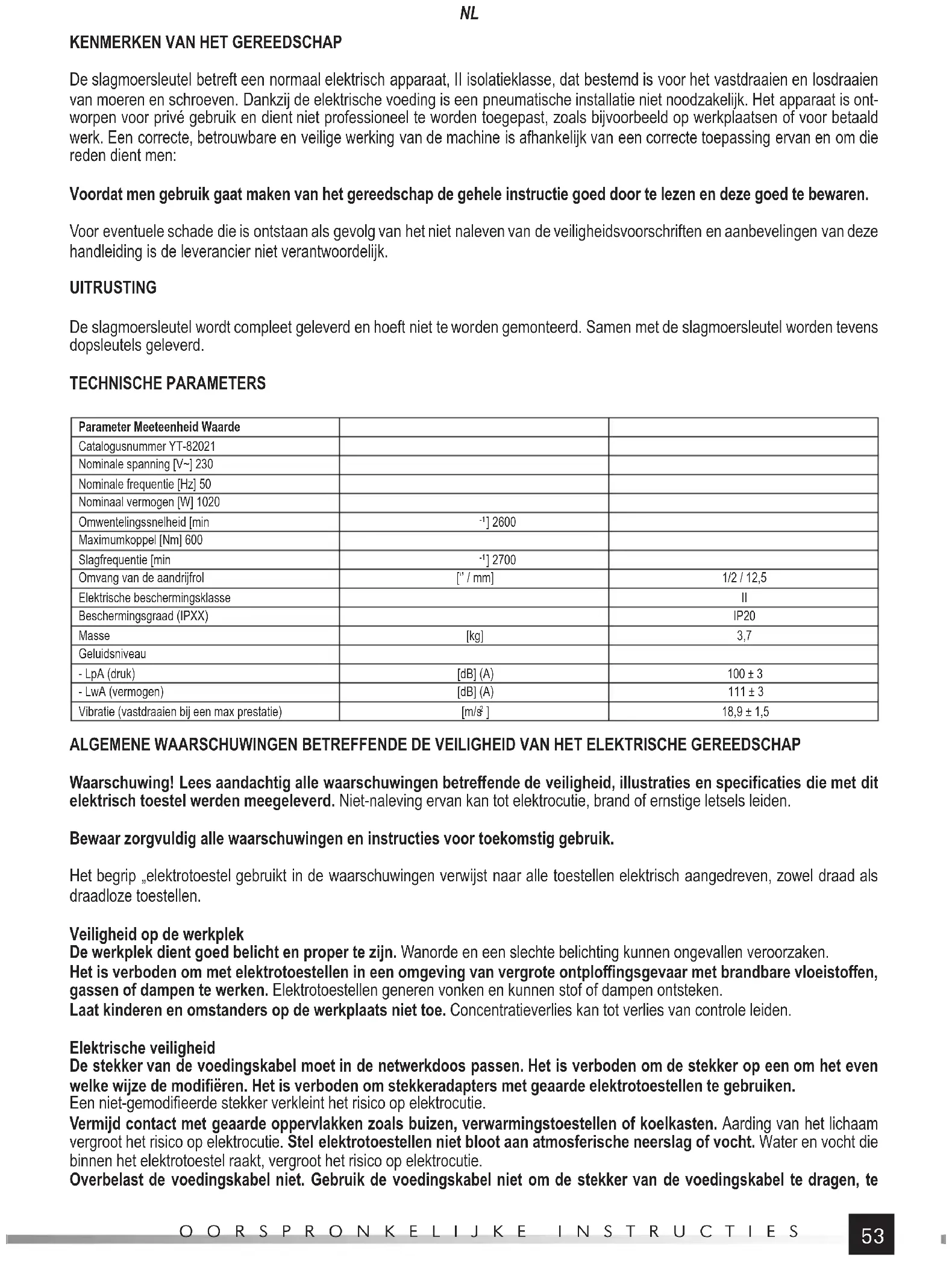 De slagmoersleutel betreft een normaal elektrisch apparaat, II isolatieklasse, dat bestemd is voor het vastdraaien en losdraaien van moeren en schroeven. Dankzij de elektrische voeding is een pneumatische installatie niet noodzakelijk. Het apparaat is ont- worpen voor privé gebruik en dient niet professioneel te worden toegepast, zoals bijvoorbeeld op werkplaatsen of voor betaald werk. Een correcte, betrouwbare en veilige werking van de machine is afhankelijk van een correcte toepassing ervan en om die reden dient men: Voordat men gebruik gaat maken van het gereedschap de gehele instructie goed door te lezen en deze goed te bewaren. Voor eventuele schade die is ontstaan als gevolg van het niet naleven van de veiligheidsvoorschriften en aanbevelingen van deze handleiding is de leverancier niet verantwoordelijk. UITRUSTING De slagmoersleutel wordt compleet geleverd en hoeft niet te worden gemonteerd. Samen met de slagmoersleutel worden tevens dopsleutels geleverd. TECHNISCHE PARAMETERS Parameter Meeteenheid Waarde Catalogusnummer YT-82021 Nominale spanning [V~] 230 Nominale frequentie [Hz] 50 Nominaal vermogen [W] 1020 Omwentelingssnelheid [min