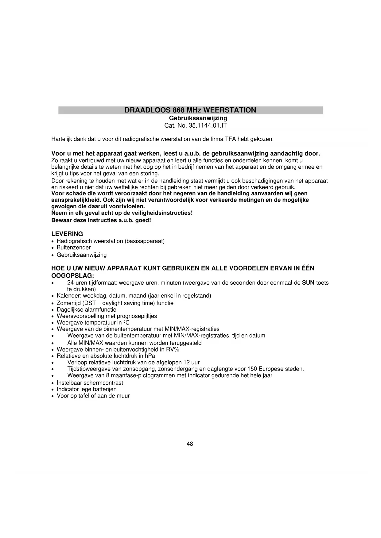 Hartelijk dank dat u voor dit radiografische weerstation van de firma TFA hebt gekozen.