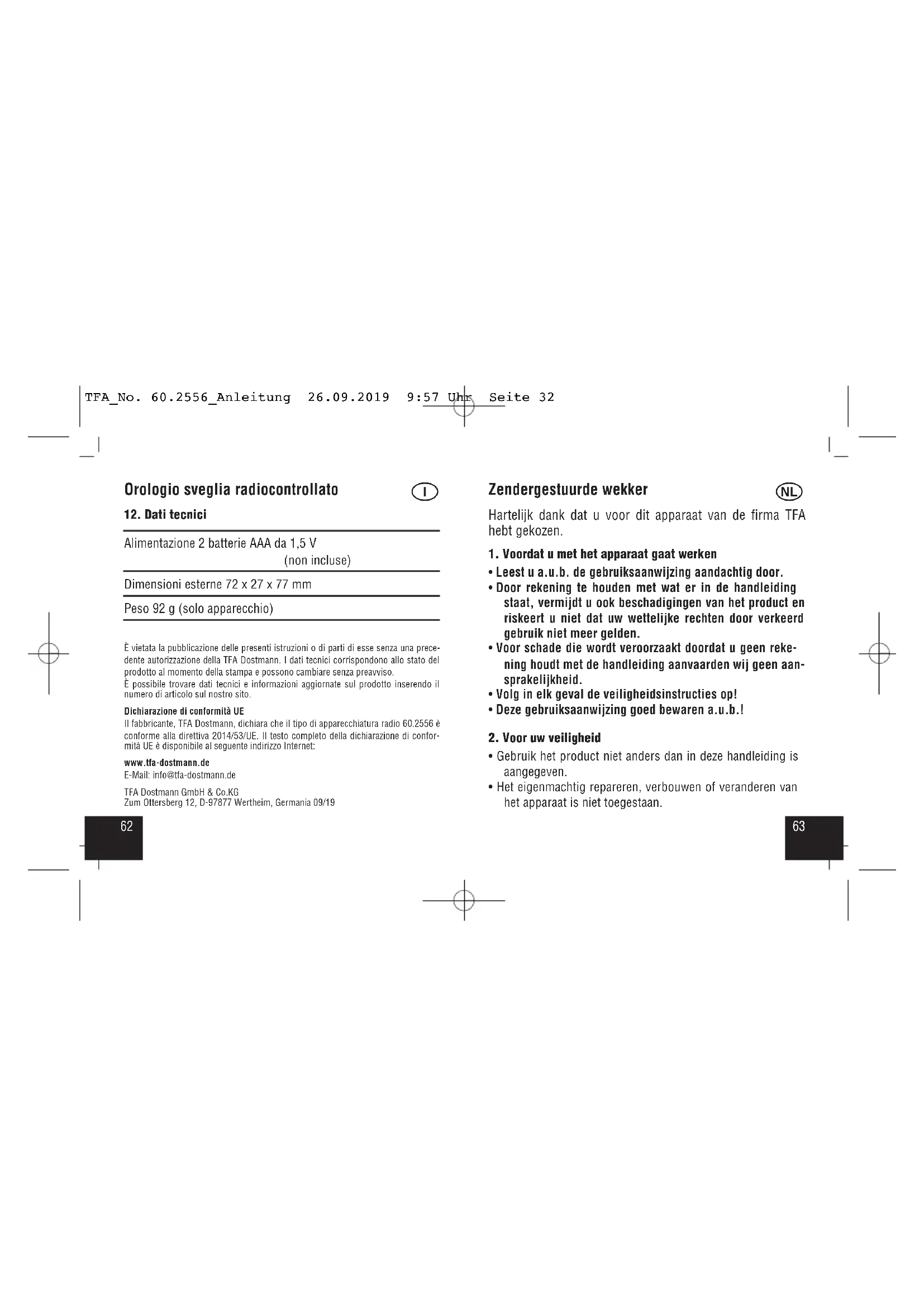 - Als de zendergestuurde klok geen DCF-signaal ontvangt (wegens storingen, afstand, enz.), kunt u de tijd ook hand- matig instellen. De klok werkt dan als een gewone kwarts- klok (zie: Manuele instellingen). TFA_No. 60.2556_Anleitung 26.09.2019 9:57 Uhr Seite 346968 Zendergestuurde wekker