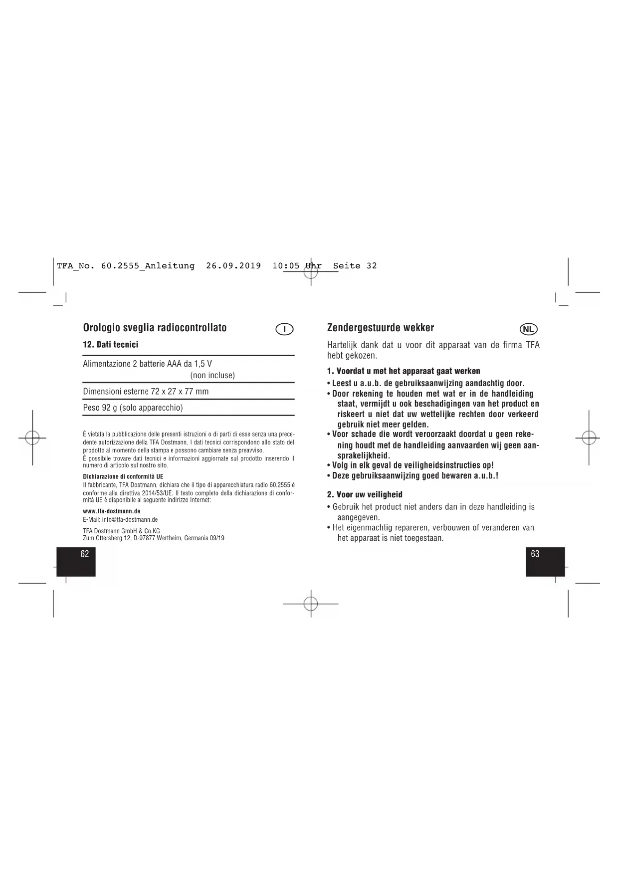 - Het eigenmachtig repareren, verbouwen of veranderen van het apparaat is niet toegestaan. TFA_No. 60.2555_Anleitung 26.09.2019 10:05 Uhr Seite 326564 Zendergestuurde wekker