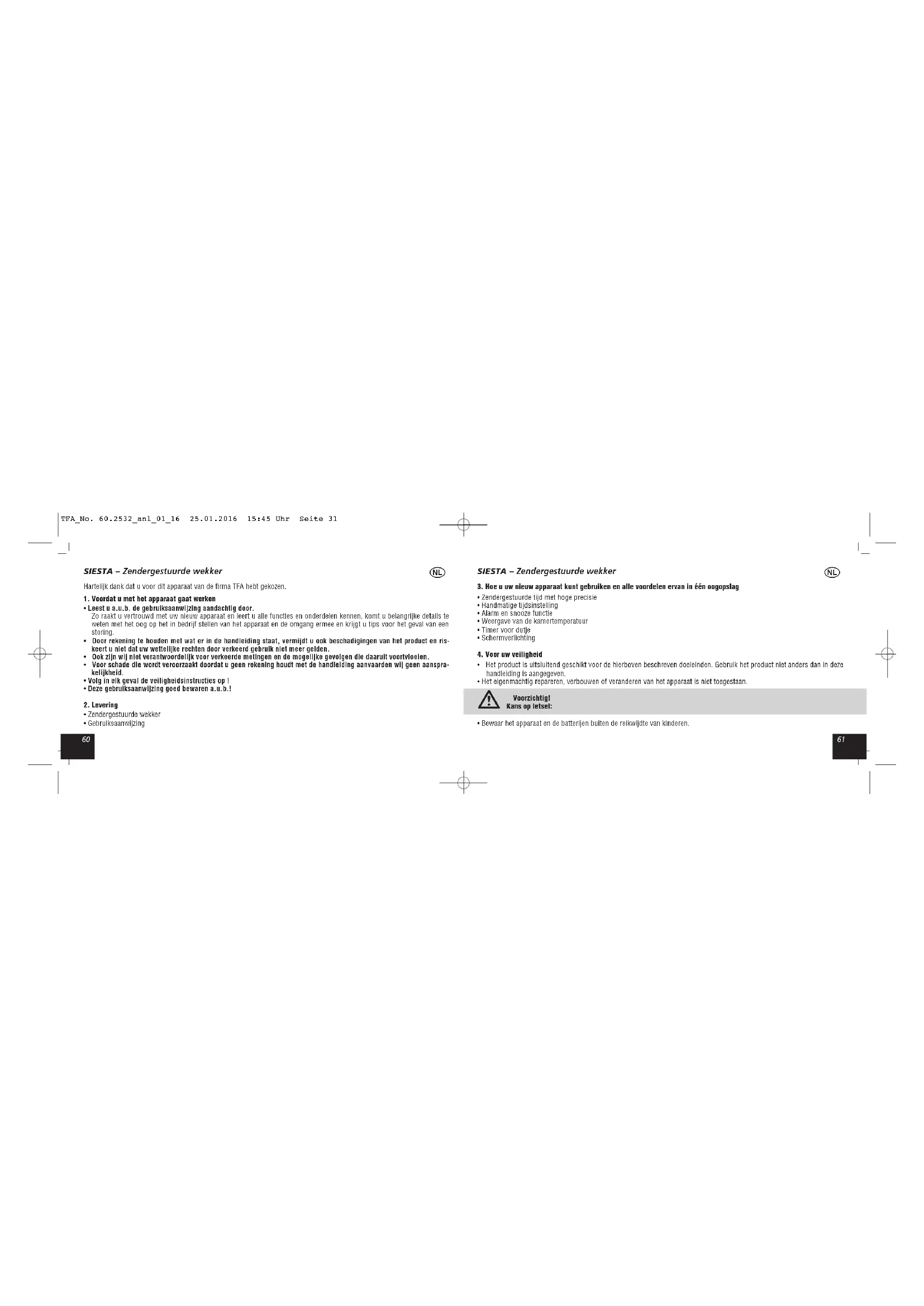 - Bewaar het apparaat en de batterijen buiten de reikwijdte van kinderen. TFA_No. 60.2532_anl_01_16 25.01.2016 15:45 Uhr Seite 316362 SIESTA – Zendergestuurde wekker