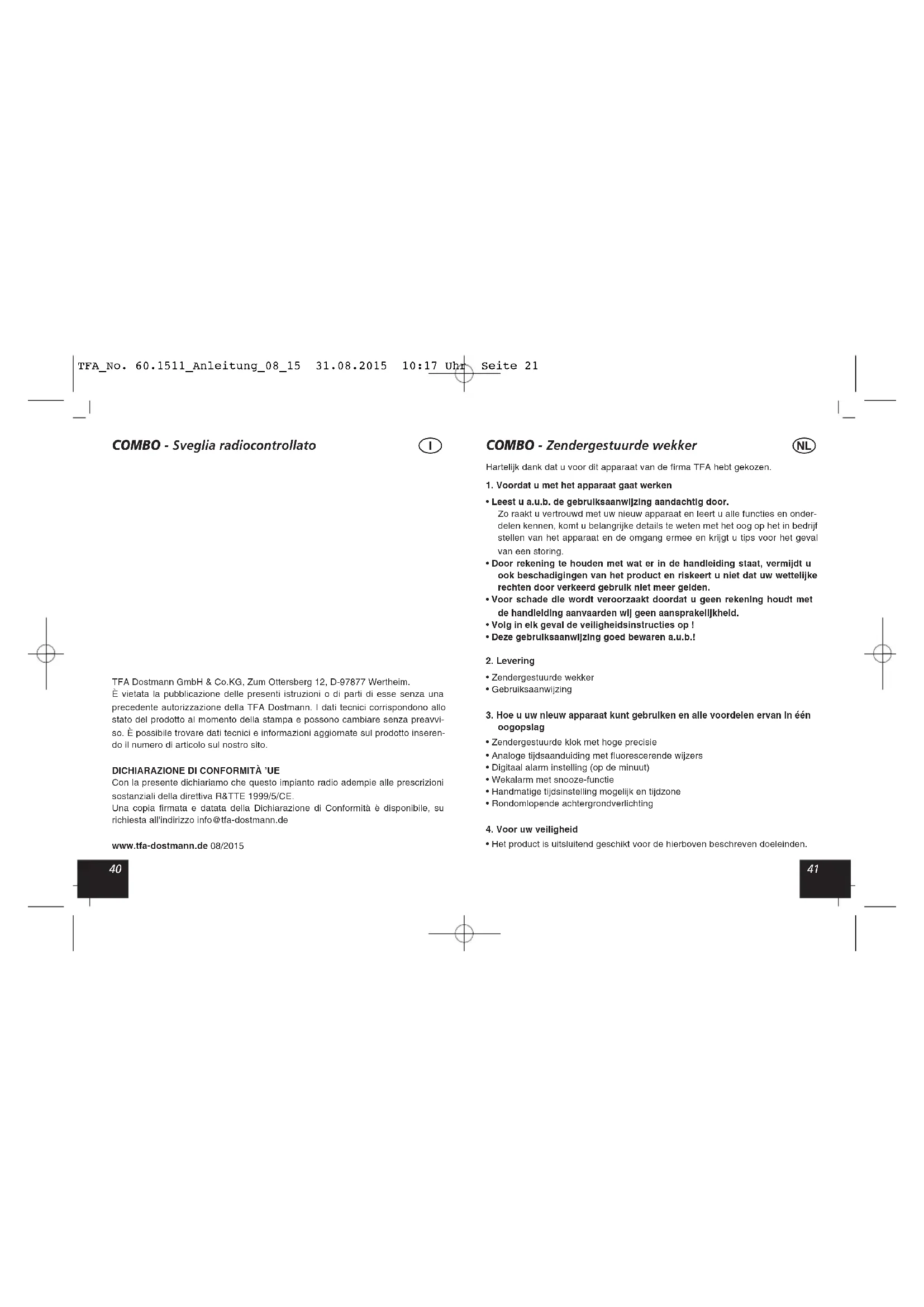 Deze gelebruksaanwijzing of gedeelten eruit mogen alleen met toestemming van TFA Dostmann worden gepubliceerd. De technische geevens van dit apparaat zich actuel bij het ter perse gonean kunnen zonder voorafgaande informatie worden gewijzigd. De nieduwste technische geevens en informatie over uw product kun t vinden door het invoeren van het artickelnummer op once homepage.