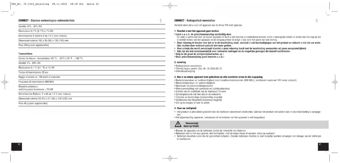 - De minimale temperatuur voor buiten sinds de laatste terugstelling wordt aangetoond met bijbehorende tijd. TFA_No. 35.1143_Anleitung 28.11.2016 18:18 Uhr Seite 244948 CONNECT - Radiografisch weerstation