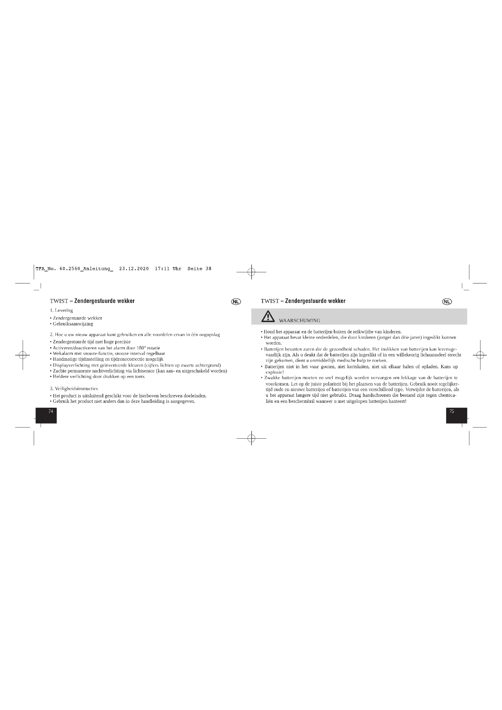 - Zwakke batterijen moeten zo snel mogelijk worden vervangen om lekkage van de batterijen te voorkomen. Let op de juiste polariteit bij het plaatsen van de batterijen. Gebruik nooit tegelijker- tijd oude en nieuwe batterijen of batterijen van een verschillend type. Verwijder de batterijen, als u het apparaat langere tijd niet gebruikt. Draag handschoenen die bestand zijn tegen chemica- liën en een beschermbril wanneer u met uitgelopen batterijen hanteert! TFA_No. 60.2560_Anleitung_ 23.12.2020 17:11 Uhr Seite 387776 TWIST – Zendergestuurde wekker