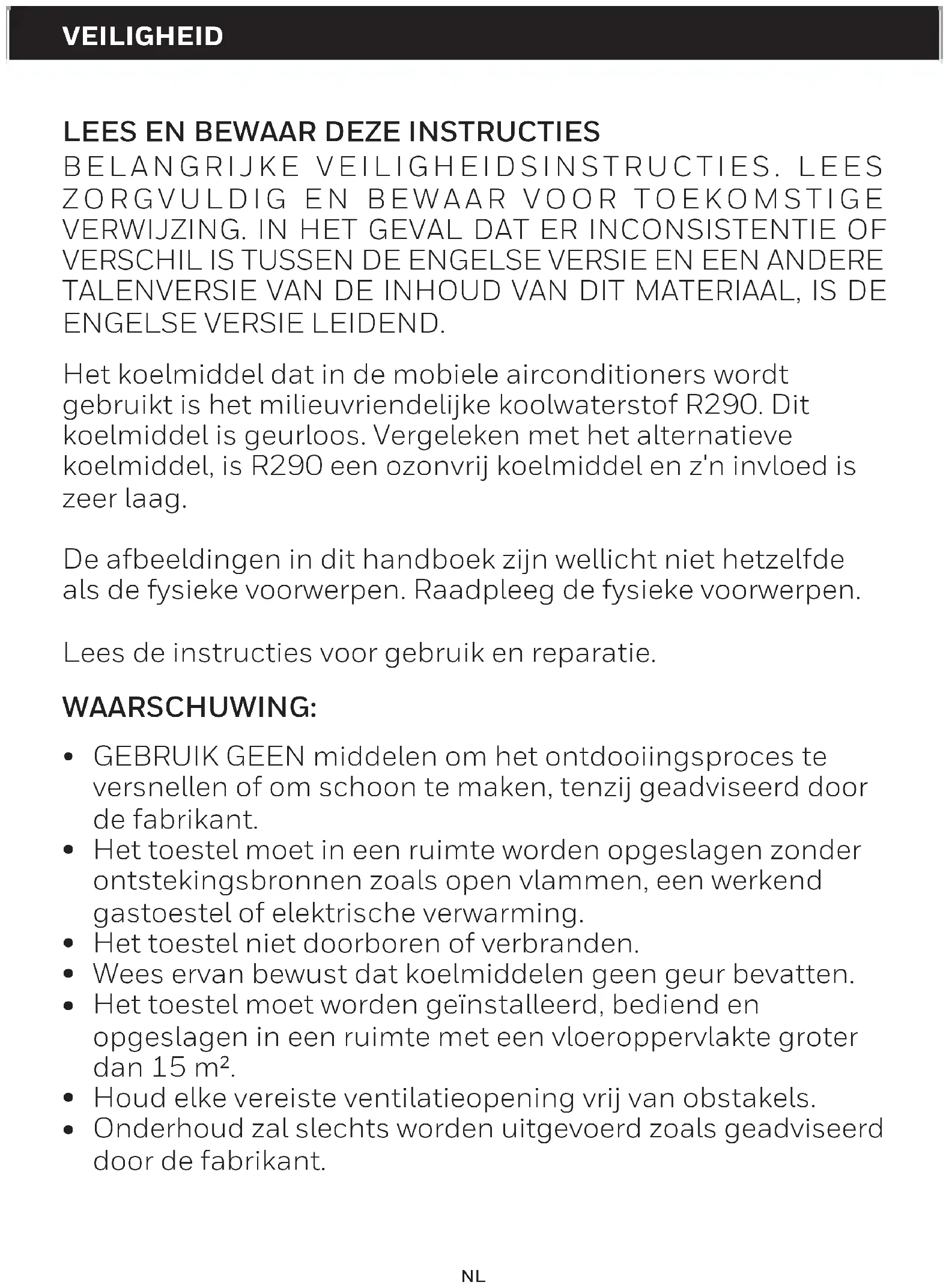 NLVEILIGHEID (VERVOLG) Bedek de luchtinvoer en -uitlaat NIET tijdens gebruik. Plaats GEEN voorwerpen, vooral zware of hete voorwerpen, aan de bovenkant van het toestel. NIET op het toestel zitten. Gebruik het apparaat NIET als het beschadigd is. Sleutel NIET aan het toestel om gevaar te voorkomen. NIET aan de stroomkabel van het apparaat trekken. De stroomkabel NIET in de deuropening plaatsen en NIET langs randen of scherpe hoeken trekken. Koelmiddelen NIET doorboren of verbranden. De ventilatieopeningen dienen vrij te zijn van obstakels. Schakel altijd het toestel uit tijdens schoonmaak of onderhoud. Haal de stekker eruit bij opslag of niet in gebruik. Koelgas kan geurloos zijn. Stagnatie van mogelijke lekken van koelmiddelengas in niet-geventileerde ruimten kunnen brand of explosiegevaar veroorzaken indien het koelmiddel in contact komt met elektrische verwarmers, fornuizen of andere bronnen van ontsteking. Zorg ervoor dat het toestel goed wordt opgeborgen om mechanische defecten te voorkomen. Gebruik alleen producten die door de fabrikant zijn aanbevolen voor ontdooiing of schoonmaak. Gebruik GEEN verlengsnoer voor dit toestel. Steek nooit uw vingers in de luchtuitlaat. Zorg er met name voor om kinderen voor deze gevaren te waarschuwen. Gebruik uw airconditioner NIET in een natte ruimte zoals een badkamer of een wasruimte. De fabrikant is niet aansprakelijk voor verwonding veroorzaakt door personen of bezitsschade door niet-naleving van de onderhoudsinstructies en ongepast gebruik van het toestel. Veiligheidsmaatregelen dienen altijd te worden nageleefd tijdens het gebruik van elektrische apparaten. Elektrische apparatuur en installaties gereguleerd door nationale wetgeving moeten worden nageleefd.