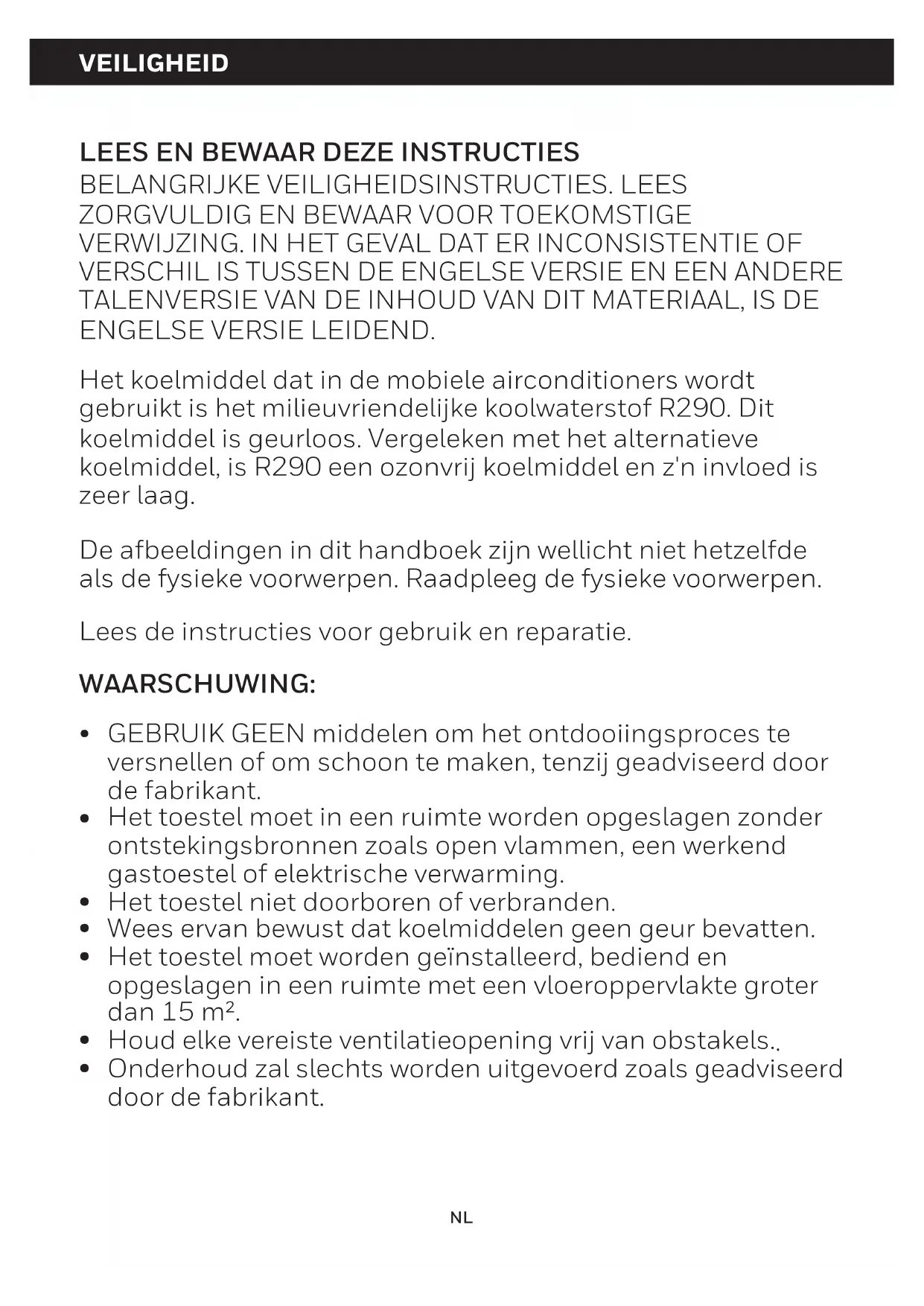 Dit teken geeft aan dat dit product niet met andere huishoudelijke apparaten mag worden weggegooid in de EU. Om mogelijke schade aan het milieu of volksgezondheid te voorkomen door ongecontroleerde afvalverwijdering, recyclet u het verantwoordelijk om het duurzame hergebruik van materialen te bevorderen.Om uw gebruikte apparaat terug te sturen, dient u gebruik te maken van inzamelingssystemen of neem contact op met de detailhandelaar waar het product werd gekocht. Zij kunnen dit product innemen en milieuvriendelijk recyclen. NLVEILIGHEID (VERVOLG) Reparatie moet worden uitgevoerd gebaseerd op aanbevelingen van de fabrikant. Onderhoud en reparatie die de assistentie vereist van ander gekwalificeerd personeel moeten onder toezicht van deskundigen gespecialiseerd in het gebruik van brandbare koelmiddelen worden uitgevoerd.