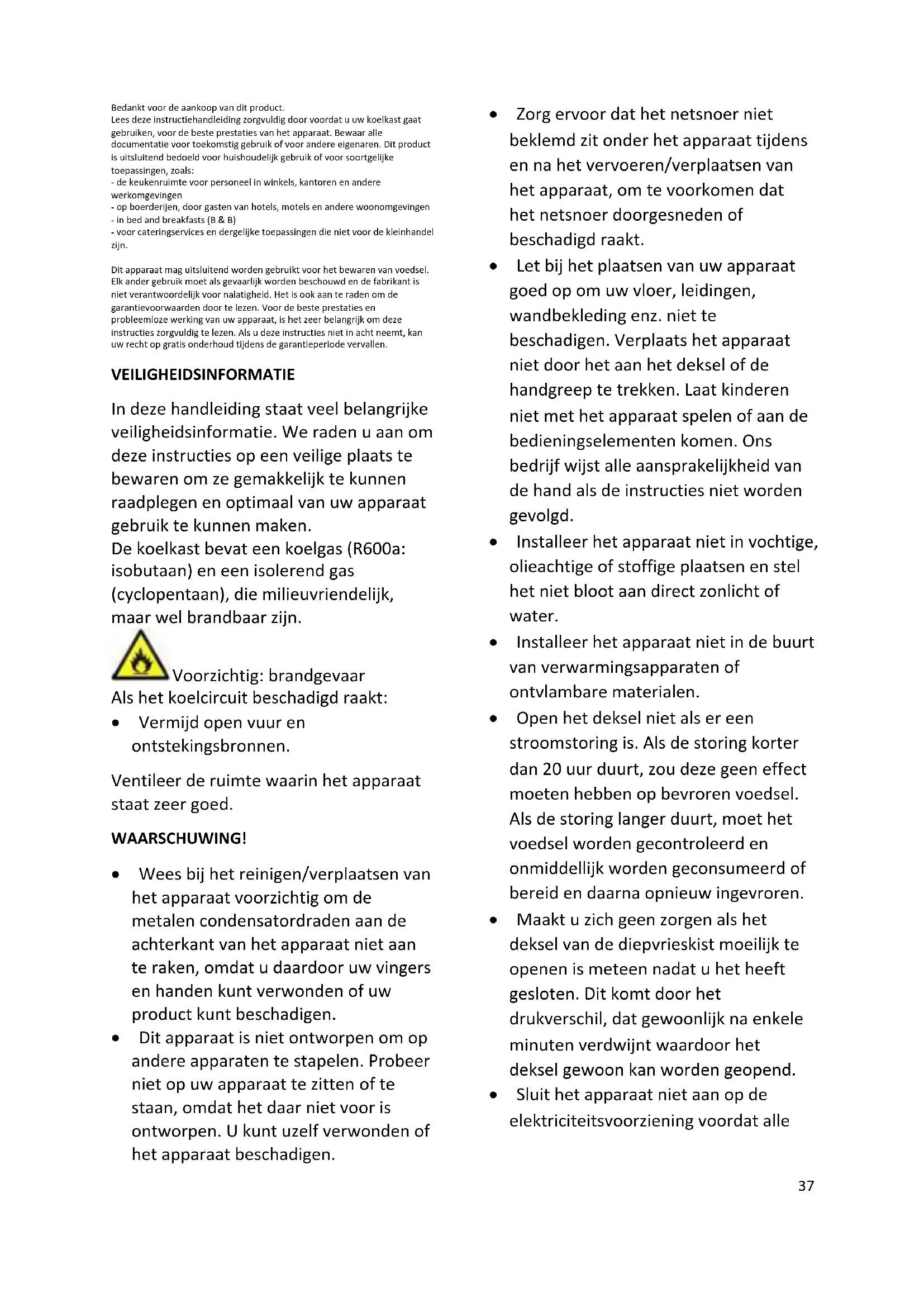Este electrodoméstico cumple la directiva europea 2012/19/EU en materia de Residuos de Aparatos Eléctricos y Electrónicos (RAEE). Los RAEE contienen tanto sustancias contaminantes (que pueden conllevar consecuencias negativas para el medio ambiente) como componentes básicos (que se pueden reutilizar). Es importante que los RAEE se sometan a tratamientos específicos para eliminar y desechar adecuadamente los contaminantes y recuperar y reciclar todos los materiales. Las personas desempeñan un papel clave a la hora de garantizar que los RAEE no se conviertan en un problema medioambiental. Para ello, es esencial seguir ciertas normas básicas: Los RAEE no deben recibir el mismo tratamiento que los residuos domésticos. Los RAEE deben depositarse en los puntos limpios pertinentes, gestionados por las autoridades locales o por empresas autorizadas. En muchos países, existe un servicio de recogida a domicilio de RAEE de gran tamaño. En muchos países, al comprar un electrodoméstico nuevo, el distribuidor podría encargarse de la recogida del antiguo de forma totalmente gratuita, siempre y cuando el equipo tenga características similares y sea del mismo tipo que el equipo suministrado. Conformidad Mediante la colocación de la marca en este producto confirmamos el cumplimiento de todos los requisitos legislativos europeos relevantes en materia de seguridad, salud y medio ambiente establecidos para este producto.37 Bedankt voor de aankoop van dit product. Lees deze instructiehandleiding zorgvuldig door voordat u uw koelkast gaat gebruiken, voor de beste prestaties van het apparaat. Bewaar alle documentatie voor toekomstig gebruik of voor andere eigenaren. Dit product is uitsluitend bedoeld voor huishoudelijk gebruik of voor soortgelijke toepassingen, zoals: - de keukenruimte voor personeel in winkels, kantoren en andere werkomgevingen - op boerderijen, door gasten van hotels, motels en andere woonomgevingen - in bed and breakfasts (B & B) - voor cateringservices en dergelijke toepassingen die niet voor de kleinhandel zijn. Dit apparaat mag uitsluitend worden gebruikt voor het bewaren van voedsel. Elk ander gebruik moet als gevaarlijk worden beschouwd en de fabrikant is niet verantwoordelijk voor nalatigheid. Het is ook aan te raden om de garantievoorwaarden door te lezen. Voor de beste prestaties en probleemloze werking van uw apparaat, is het zeer belangrijk om deze instructies zorgvuldig te lezen. Als u deze instructies niet in acht neemt, kan uw recht op gratis onderhoud tijdens de garantieperiode vervallen. VEILIGHEIDSINFORMATIE In deze handleiding staat veel belangrijke veiligheidsinformatie. We raden u aan om deze instructies op een veilige plaats te bewaren om ze gemakkelijk te kunnen raadplegen en optimaal van uw apparaat gebruik te kunnen maken. De koelkast bevat een koelgas (R600a: isobutaan) en een isolerend gas (cyclopentaan), die milieuvriendelijk, maar wel brandbaar zijn. Voorzichtig: brandgevaar Als het koelcircuit beschadigd raakt: