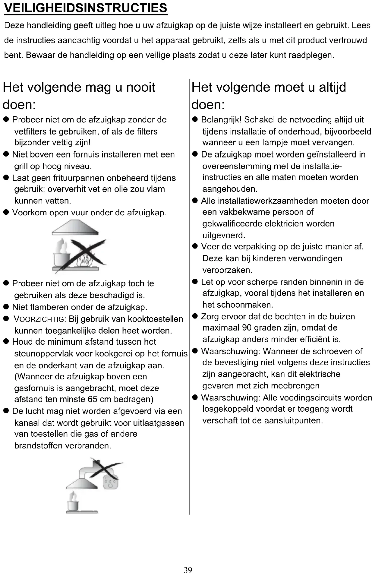⚫ Probeer niet om de afzuigkap toch te gebruiken als deze beschadigd is. ⚫ Niet flamberen onder de afzuigkap. ⚫ VOORZICHTIG: Bij gebruik van kooktoestellen kunnen toegankelijke delen heet worden. ⚫ Houd de minimum afstand tussen het steunoppervlak voor kookgerei op het fornuis en de onderkant van de afzuigkap aan. (Wanneer de afzuigkap boven een gasfornuis is aangebracht, moet deze afstand ten minste 65 cm bedragen) ⚫ De lucht mag niet worden afgevoerd via een kanaal dat wordt gebruikt voor uitlaatgassen van toestellen die gas of andere brandstoffen verbranden.40 Het volgende moet u altijd doen: ⚫ Doe altijd het deksel op de potten en pannen wanneer u op een gasfornuis kookt. ⚫ Wanneer het apparaat in de afzuigstand staat, wordt de lucht in de kamer door de afzuigkap weggezogen. Zorg ervoor dat de juiste ventilatiemaatregelen worden nageleefd. De afzuigkap verwijdert geuren uit de kamer, maar geen stoom. ⚫ De afzuigkap is uitsluitend bedoeld voor huishoudelijk gebruik. Het volgende moet u altijd doen: ⚫ Voorzichtig: Tijdens gebruik kunnen het apparaat en de toegankelijke delen ervan erg heet worden. Let op wanneer u de verwarmingselementen aanraakt. Kinderen jonger dan 8 jaar moeten uit de buurt blijven, tenzij er voortdurend toezicht is. ⚫ Zorg voor voldoende ventilatie van de ruimte wanneer de afzuigkap gelijktijdig wordt gebruikt met toestellen die gas of andere brandstoffen verbranden. ⚫ Er bestaat brandgevaar als de reiniging niet conform de instructies wordt uitgevoerd. ⚫ De voorschriften betreffende de afvoer van lucht dienen te worden gerespecteerd. ⚫ Reinig uw apparaat regelmatig volgens de methode die in het hoofdstuk ONDERHOUD is beschreven. ⚫ Vanwege de veiligheid mag u uitsluitend het formaat bevestigings- of montageschroeven gebruiken, die in deze handleiding worden aanbevolen. ⚫ Raadpleeg het hoofdstuk over onderhoud en de reiniging voor meer informatie over reinigingsmethode en -frequentie. ⚫ Het schoonmaken en het onderhoud mag niet door kinderen worden uitgevoerd als er geen toezicht is. ⚫ Wanneer de afzuigkap en apparaten die met andere energie dan elektriciteit worden gevoed tegelijkertijd in werking zijn, mag de onderdruk in de ruimte niet meer bedragen dan 4 Pa (4 x 10-5 bar). ⚫ WAARSCHUWING: Brandgevaar: gebruik de kookoppervlakken niet als bewaarplek voor spullen. ⚫ Er mag geen stoomreiniger worden gebruikt. ⚫ Probeer NOOIT om brand met water te blussen, maar schakel het apparaat uit en bedek de vlam dan met bijvoorbeeld een deksel of een branddeken.