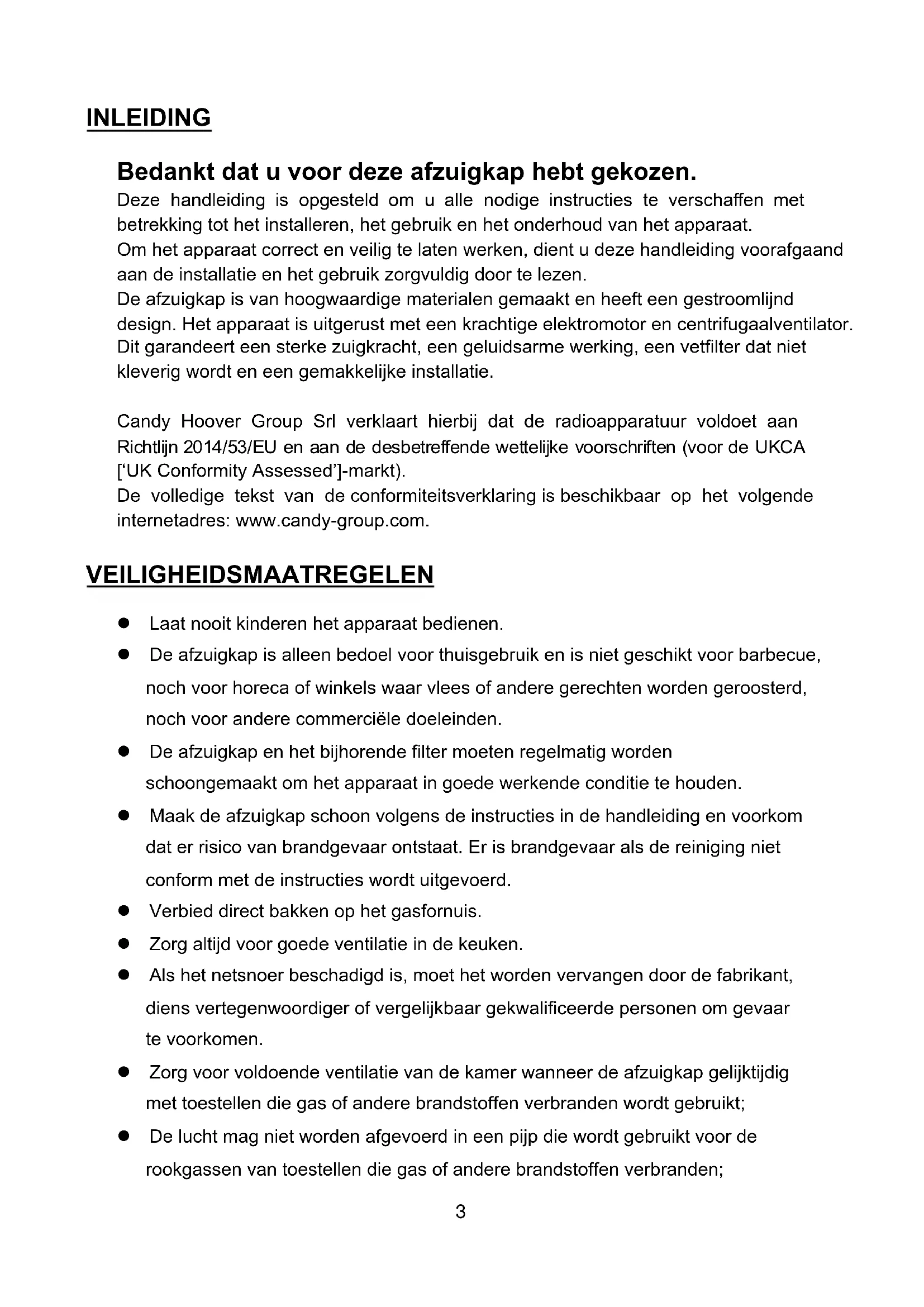 - MILIEUBESCHERMING INLEIDING Bedankt dat u voor deze afzuigkap hebt gekozen. Deze handleiding is opgesteld om u alle nodige instructies te verschaffen met betrekking tot het installeren, het gebruik en het onderhoud van het apparaat. Om het apparaat correct en veilig te laten werken, dient u deze handleiding voorafgaand aan de installatie en het gebruik zorgvuldig door te lezen. De afzuigkap is van hoogwaardige materialen gemaakt en heeft een gestroomlijnd design. Het apparaat is uitgerust met een krachtige elektromotor en centrifugaalventilator. Dit garandeert een sterke zuigkracht, een geluidsarme werking, een vetfilter dat niet kleverig wordt en een gemakkelijke installatie. Candy Hoover Group Srl verklaart hierbij dat de radioapparatuur voldoet aan Richtlijn 2014/53/EU en aan de desbetreffende wettelijke voorschriften (voor de UKCA [‘UK Conformity Assessed’]-markt). De volledige tekst van de conformiteitsverklaring is beschikbaar op het volgende internetadres: www.candy-group.com. VEILIGHEIDSMAATREGELEN ⚫ Laat nooit kinderen het apparaat bedienen. ⚫ De afzuigkap is alleen bedoel voor thuisgebruik en is niet geschikt voor barbecue, noch voor horeca of winkels waar vlees of andere gerechten worden geroosterd, noch voor andere commerciële doeleinden. ⚫ De afzuigkap en het bijhorende filter moeten regelmatig worden schoongemaakt om het apparaat in goede werkende conditie te houden. ⚫ Maak de afzuigkap schoon volgens de instructies in de handleiding en voorkom dat er risico van brandgevaar ontstaat. Er is brandgevaar als de reiniging niet conform met de instructies wordt uitgevoerd. ⚫ Verbied direct bakken op het gasfornuis. ⚫ Zorg altijd voor goede ventilatie in de keuken. ⚫ Als het netsnoer beschadigd is, moet het worden vervangen door de fabrikant, diens vertegenwoordiger of vergelijkbaar gekwalificeerde personen om gevaar te voorkomen. ⚫ Zorg voor voldoende ventilatie van de kamer wanneer de afzuigkap gelijktijdig met toestellen die gas of andere brandstoffen verbranden wordt gebruikt; ⚫ De lucht mag niet worden afgevoerd in een pijp die wordt gebruikt voor de rookgassen van toestellen die gas of andere brandstoffen verbranden;4 ⚫ De voorschriften betreffende de afvoer van lucht dienen te worden gerespecteerd. ⚫ Dit apparaat mag worden gebruikt door kinderen vanaf 8 jaar en door personen met verminderde lichamelijke, zintuiglijke of geestelijke vermogens of met een gebrek aan kennis en ervaring, mits zij onder toezicht worden gehouden of instructies hebben gekregen om het apparaat veilig te kunnen gebruiken en de gevaren begrijpen die ermee gepaard gaan. ⚫ Houd kinderen in de gaten, om te voorkomen dat zij met het apparaat spelen. ⚫ Het schoonmaken en het onderhoud mag niet door kinderen worden uitgevoerd als er geen toezicht is. ⚫ Niet onder de afzuigkap flamberen. ⚫ VOORZICHTIG: Bij gebruik van kooktoestellen kunnen toegankelijke ⚫ delen heet worden. ⚫ De waarschuwing moet in hetzelfde deel staan van de instructies met de aanwijzingen hoe het apparaat te monteren. Gevaar voor elektrische schok ⚫ Sluit dit toestel uitsluitend aan op een correct geaard stopcontact. Neem bij twijfel contact op met een gekwalificeerde elektromonteur voor advies. ⚫ Niet opvolgen van deze instructies kan leiden tot de dood, brand of elektrische schok. p. 143