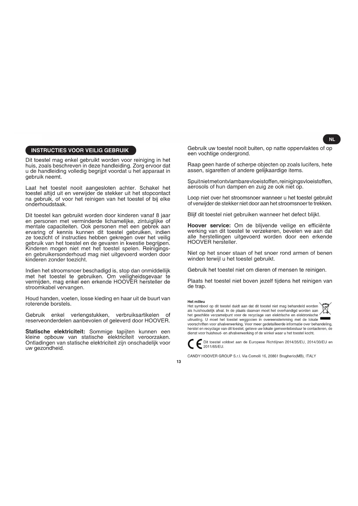 Dit toestel mag enkel gebruikt worden voor reiniging in het huis, zoals beschreven in deze handleiding. Zorg ervoor dat u de handleiding volledig begrijpt voordat u het apparaat in gebruik neemt. Laat het toestel nooit aangesloten achter. Schakel het toestel altijd uit en verwijder de stekker uit het stopcontact na gebruik, of voor het reinigen van het toestel of bij elke onderhoudstaak. Dit toestel kan gebruikt worden door kinderen vanaf 8 jaar en personen met verminderde lichamelijke, zintuiglijke of mentale capaciteiten. Ook personen met een gebrek aan ervaring of kennis kunnen dit toestel gebruiken, indien ze toezicht of instructies hebben gekregen over het veilig gebruik van het toestel en de gevaren in kwestie begrijpen. Kinderen mogen niet met het toestel spelen. Reinigings- en gebruikersonderhoud mag niet uitgevoerd worden door kinderen zonder toezicht. Indien het stroomsnoer beschadigd is, stop dan onmiddellijk met het toestel te gebruiken. Om veiligheidsgevaar te vermijden, mag enkel een erkende HOOVER hersteller de stroomkabel vervangen. Houd handen, voeten, losse kleding en haar uit de buurt van roterende borstels. Gebruik enkel verlengstukken, verbruiksartikelen of reserveonderdelen aanbevolen of geleverd door HOOVER. Statische elektriciteit: Sommige tapijten kunnen een kleine opbouw van statische elektriciteit veroorzaken. Ontladingen van statische elektriciteit zijn onschadelijk voor uw gezondheid. Gebruik uw toestel nooit buiten, op natte oppervlaktes of op een vochtige ondergrond. Raap geen harde of scherpe objecten op zoals lucifers, hete assen, sigaretten of andere gelijkaardige items. Spuit niet met ontvlambare vloeistoffen, reinigingsvloeistoffen, aerosols of hun dampen en zuig ze ook niet op. Loop niet over het stroomsnoer wanneer u het toestel gebruikt of verwijder de stekker niet door aan het stroomsnoer te trekken. Blijf dit toestel niet gebruiken wanneer het defect blijkt. Hoover service: Om de blijvende veilige en efciënte werking van dit toestel te verzekeren, bevelen we aan dat alle herstellingen uitgevoerd worden door een erkende HOOVER hersteller. Niet op het snoer staan of het snoer rond armen of benen winden terwijl u het toestel gebruikt. Gebruik het toestel niet om dieren of mensen te reinigen. Plaats het toestel niet boven jezelf tijdens het reinigen van de trap. Het milieu Het symbool op dit toestel duidt aan dat dit toestel niet mag behandeld worden als huishoudelijk afval. In de plaats daarvan moet het overhandigd worden aan het geschikte verzamelpunt voor de recyclage van elektrische en elektronische uitrusting. U moet het toestel weggooien in overeenstemming met de lokale voorschriften voor afvalverwerking. Voor meer gedetailleerde informatie over behandeling, herstel en recyclage van dit toestel, gelieve uw lokale gemeentebestuur te contacteren, de dienst voor huishoud- en afvalverwerking of de winkel waar u het toestel kocht. Dit toestel voldoet aan de Europese Richtlijnen 2014/35/EU, 2014/30/EU en 2011/65/EU. CANDY HOOVER GROUP S.r.l. Via Comolli 16, 20861 Brugherio(MB), ITALY NL14 L. Regelschuif Zuiging M. Tapijt- en vloermondstuk** N. Hoofdstofzuiger O. Ontgrendeling klep van stofzak P. Zakhouder Q. Pre-motor lter omlijsting R. Pre-motor lter S. Uitlaatlter T. Mini turboborstel voor dierenharen* U. Miniturbomondstuk allergieverwijderaar*