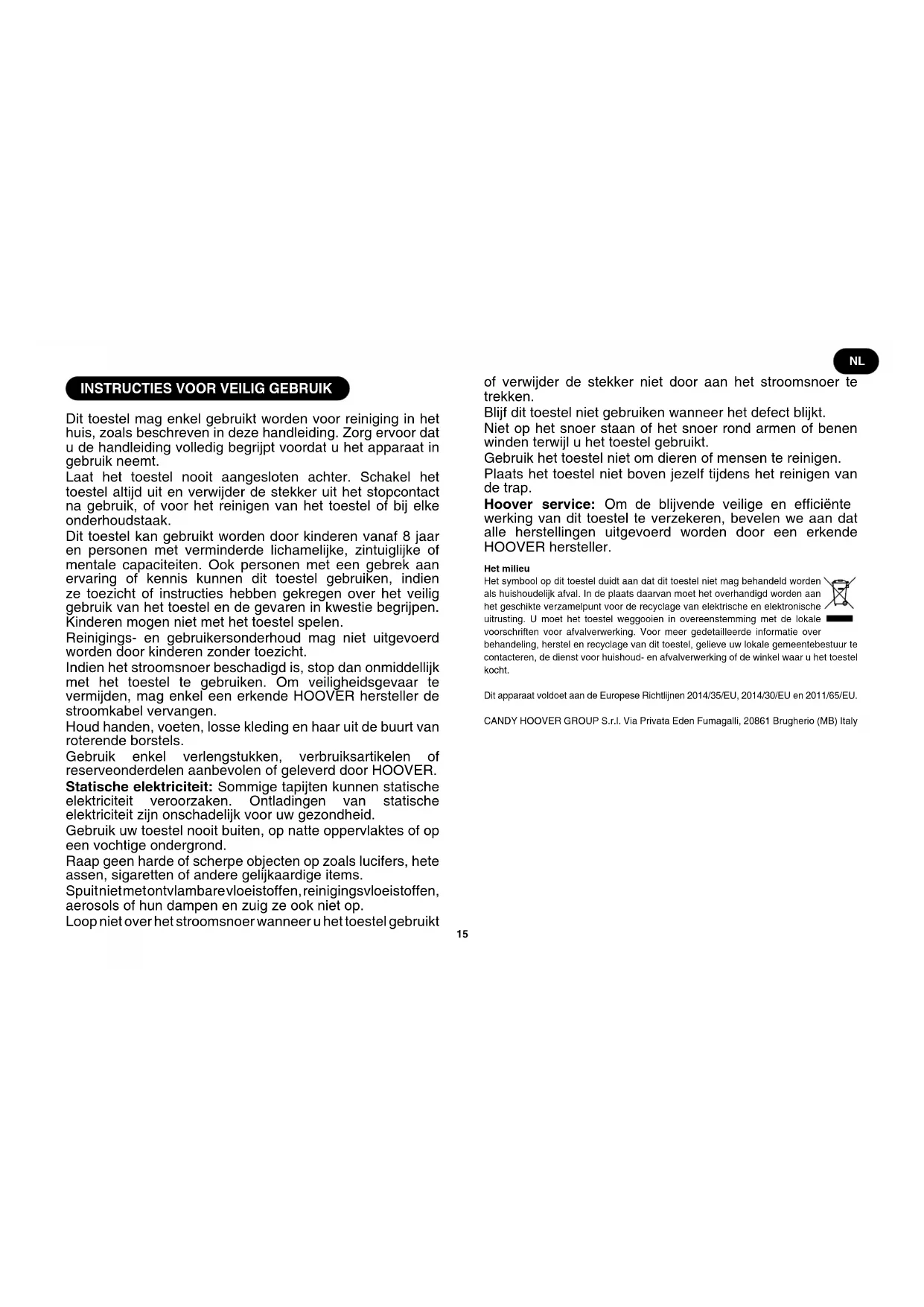 Dit toestel mag enkel gebruikt worden voor reiniging in het huis, zoals beschreven in deze handleiding. Zorg ervoor dat u de handleiding volledig begrijpt voordat u het apparaat in gebruik neemt. Laat het toestel nooit aangesloten achter. Schakel het toestel altijd uit en verwijder de stekker uit het stopcontact na gebruik, of voor het reinigen van het toestel of bij elke onderhoudstaak. Dit toestel kan gebruikt worden door kinderen vanaf 8 jaar en personen met verminderde lichamelijke, zintuiglijke of mentale capaciteiten. Ook personen met een gebrek aan ervaring of kennis kunnen dit toestel gebruiken, indien ze toezicht of instructies hebben gekregen over het veilig gebruik van het toestel en de gevaren in kwestie begrijpen. Kinderen mogen niet met het toestel spelen. Reinigings- en gebruikersonderhoud mag niet uitgevoerd worden door kinderen zonder toezicht. Indien het stroomsnoer beschadigd is, stop dan onmiddellijk met het toestel te gebruiken. Om veiligheidsgevaar te vermijden, mag enkel een erkende HOOVER hersteller de stroomkabel vervangen. Houd handen, voeten, losse kleding en haar uit de buurt van roterende borstels. Gebruik enkel verlengstukken, verbruiksartikelen of reserveonderdelen aanbevolen of geleverd door HOOVER. Statische elektriciteit: Sommige tapijten kunnen statische elektriciteit veroorzaken. Ontladingen van statische elektriciteit zijn onschadelijk voor uw gezondheid. Gebruik uw toestel nooit buiten, op natte oppervlaktes of op een vochtige ondergrond. Raap geen harde of scherpe objecten op zoals lucifers, hete assen, sigaretten of andere gelijkaardige items. Spuit niet met ontvlambare vloeistoffen, reinigingsvloeistoffen, aerosols of hun dampen en zuig ze ook niet op. Loop niet over het stroomsnoer wanneer u het toestel gebruikt of verwijder de stekker niet door aan het stroomsnoer te trekken. Blijf dit toestel niet gebruiken wanneer het defect blijkt. Niet op het snoer staan of het snoer rond armen of benen winden terwijl u het toestel gebruikt. Gebruik het toestel niet om dieren of mensen te reinigen. Plaats het toestel niet boven jezelf tijdens het reinigen van de trap. Hoover service: Om de blijvende veilige en efciënte werking van dit toestel te verzekeren, bevelen we aan dat alle herstellingen uitgevoerd worden door een erkende HOOVER hersteller. Het milieu Het symbool op dit toestel duidt aan dat dit toestel niet mag behandeld worden als huishoudelijk afval. In de plaats daarvan moet het overhandigd worden aan het geschikte verzamelpunt voor de recyclage van elektrische en elektronische uitrusting. U moet het toestel weggooien in overeenstemming met de lokale voorschriften voor afvalverwerking. Voor meer gedetailleerde informatie over behandeling, herstel en recyclage van dit toestel, gelieve uw lokale gemeentebestuur te contacteren, de dienst voor huishoud- en afvalverwerking of de winkel waar u het toestel kocht. Dit apparaat voldoet aan de Europese Richtlijnen 2014/35/EU, 2014/30/EU en 2011/65/EU. CANDY HOOVER GROUP S.r.l. Via Privata Eden Fumagalli, 20861 Brugherio (MB) Italy16
