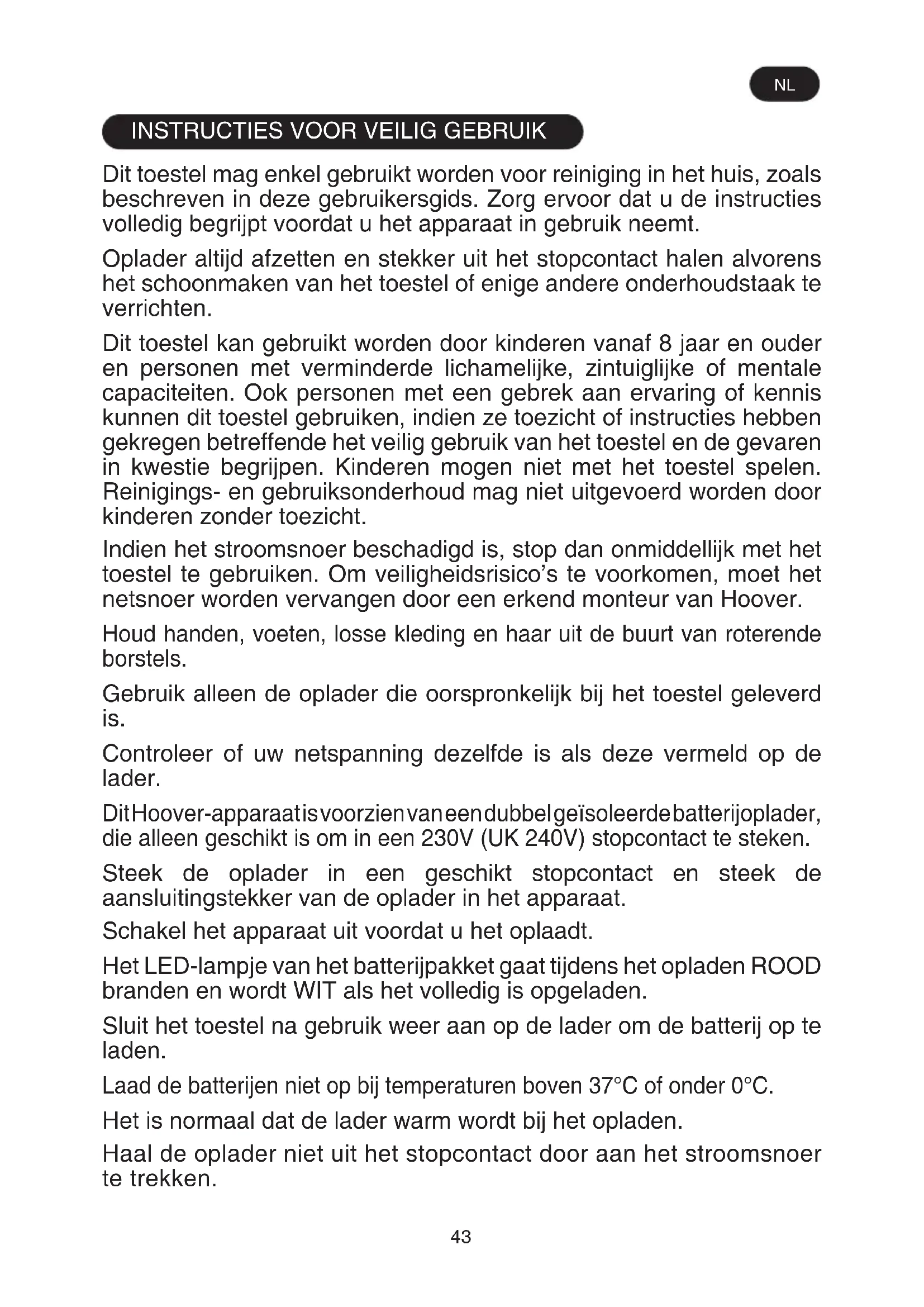 Dit toestel mag enkel gebruikt worden voor reiniging in het huis, zoals beschreven in deze gebruikersgids. Zorg ervoor dat u de instructies volledig begrijpt voordat u het apparaat in gebruik neemt. Oplader altijd afzetten en stekker uit het stopcontact halen alvorens het schoonmaken van het toestel of enige andere onderhoudstaak te verrichten. Dit toestel kan gebruikt worden door kinderen vanaf 8 jaar en ouder en personen met verminderde lichamelijke, zintuiglijke of mentale capaciteiten. Ook personen met een gebrek aan ervaring of kennis kunnen dit toestel gebruiken, indien ze toezicht of instructies hebben gekregen betreffende het veilig gebruik van het toestel en de gevaren in kwestie begrijpen. Kinderen mogen niet met het toestel spelen. Reinigings- en gebruiksonderhoud mag niet uitgevoerd worden door kinderen zonder toezicht. Indien het stroomsnoer beschadigd is, stop dan onmiddellijk met het toestel te gebruiken. Om veiligheidsrisico’s te voorkomen, moet het netsnoer worden vervangen door een erkend monteur van Hoover. Houd handen, voeten, losse kleding en haar uit de buurt van roterende borstels. Gebruik alleen de oplader die oorspronkelijk bij het toestel geleverd is. Controleer of uw netspanning dezelfde is als deze vermeld op de lader. Dit Hoover-apparaat is voorzien van een dubbel geïsoleerde batterijoplader, die alleen geschikt is om in een 230V (UK 240V) stopcontact te steken. Steek de oplader in een geschikt stopcontact en steek de aansluitingstekker van de oplader in het apparaat. Schakel het apparaat uit voordat u het oplaadt. Het LED-lampje van het batterijpakket gaat tijdens het opladen ROOD branden en wordt WIT als het volledig is opgeladen. Sluit het toestel na gebruik weer aan op de lader om de batterij op te laden. Laad de batterijen niet op bij temperaturen boven 37°C of onder 0°C. Het is normaal dat de lader warm wordt bij het opladen. Haal de oplader niet uit het stopcontact door aan het stroomsnoer te trekken. NL44 Haal bij langere afwezigheid (vakanties, etc.) de oplader uit het stopcontact. Laad het product opnieuw op voor gebruik, aangezien batterijen uit zichzelf kunnen ontladen tijdens langere opslagperiodes. In het geval dat u het apparaat weg doet, dienen de batterijen eerst verwijderd te worden. Bij het verwijderen van de batterij moet het apparaat ontkoppeld zijn van het net. Gooi de batterijen veilig weg. Laat het apparaat doorwerken totdat het stopt en de batterijen volledig ontladen zijn. Gebruikte batterijen moeten naar een recyclagecentrum gebracht worden en mogen niet bij het huishoudelijk afval weggegooid worden. Om de batterijen te verwijderen neem contact op met de Hoover klantendienst, of ga verder volgens deze instructies. BELANGRIJK: Maak de batterijen helemaal leeg voordat u ze verwijdert. Laat de reiniger draaien totdat de batterijen helemaal leeg zijn. Verwijder de stekker van de oplader uit het toestel. Druk op de ontgrendelingsknoppen van de batterij en schuif deze eruit om te verwijderen. OPMERKING: Mocht u enige problemen ondervinden met het uit elkaar halen van het voorwerp, of voor meer gedetailleerde informatie over behandeling, herstel en recyclage van dit apparaat, neem contact op met uw lokale gemeente of de afvalreinigingsdienst. Gebruik enkel toebehoren, gebruiksartikelen of reserveonderdelen die door Hoover aanbevolen of geleverd worden. Statische elektriciteit: Sommige tapijten kunnen een kleine opbouw van statische elektriciteit veroorzaken. Ontladingen van statische elektriciteit zijn onschadelijk voor uw gezondheid. Gebruik je toestel nooit buiten of op natte oppervlaktes of om vocht op te nemen. Raap geen harde of scherpe objecten op zoals lucifers, hete assen, sigaretten of andere gelijkaardige items. Spuit niet met ontvlambare vloeistoffen, reinigingsvloeistoffen, aerosols of hun dampen en zuig ze ook niet op. Loop niet over het stroomsnoer wanneer je het toestel gebruikt of verwijder de stekker niet door aan het stroomsnoer te trekken. Gebruik uw apparaat of oplader niet als deze defect blijkt te zijn. Hoover service: Om de veilige en doeltreffende werking van het apparaat te verzekeren, adviseren wij om onderhoud of reparaties alleen door een erkende onderhoudsmonteur van Hoover te laten uitvoeren. NLPRODUCTONDERDELEN Frequentiebanden 2400Mhz ~ 2483.5Mhz Maximaal in de frequentieband verstuurd hoogfrequent vermogen