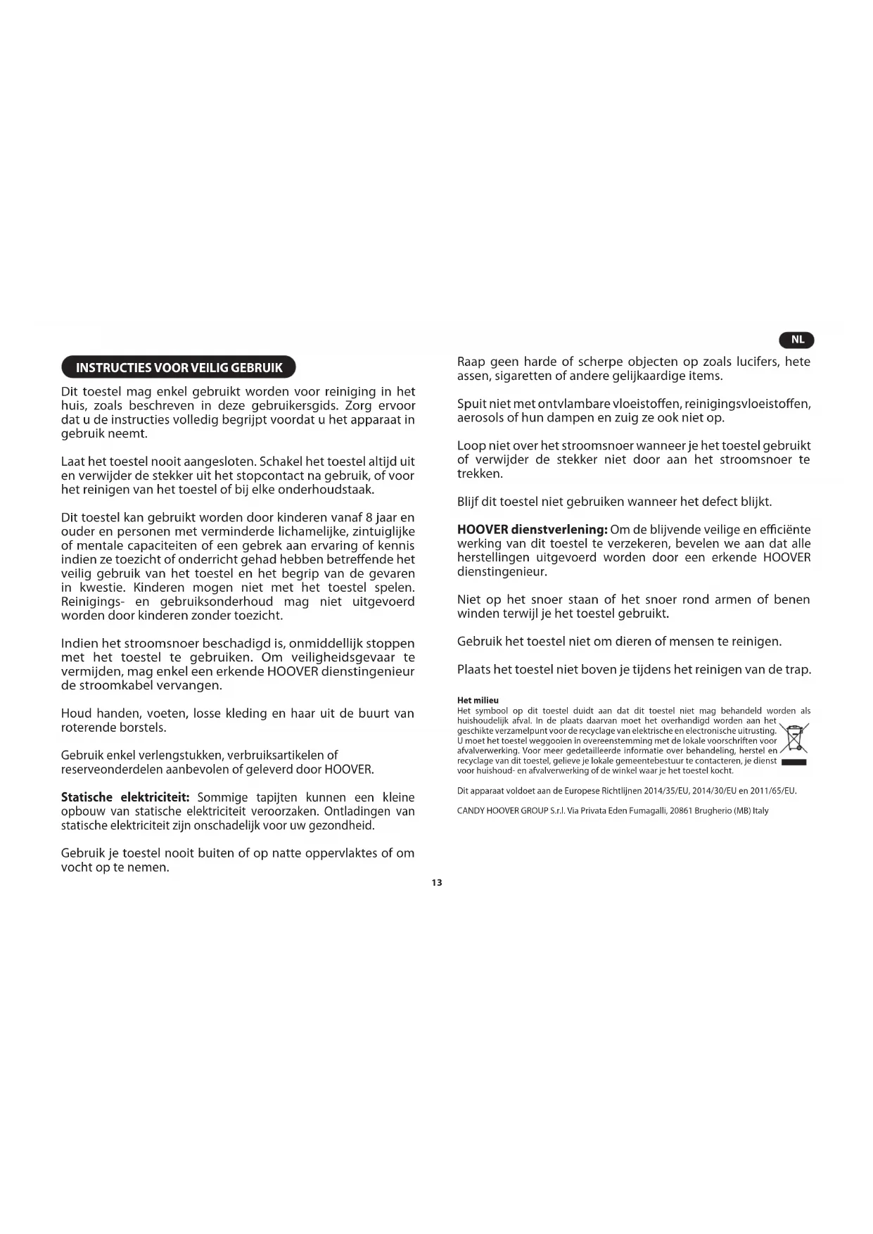 Dit toestel mag enkel gebruikt worden voor reiniging in het huis, zoals beschreven in deze gebruikersgids. Zorg ervoor dat u de instructies volledig begrijpt voordat u het apparaat in gebruik neemt. Laat het toestel nooit aangesloten. Schakel het toestel altijd uit en verwijder de stekker uit het stopcontact na gebruik, of voor het reinigen van het toestel of bij elke onderhoudstaak. Dit toestel kan gebruikt worden door kinderen vanaf 8 jaar en ouder en personen met verminderde lichamelijke, zintuiglijke of mentale capaciteiten of een gebrek aan ervaring of kennis indien ze toezicht of onderricht gehad hebben betreende het veilig gebruik van het toestel en het begrip van de gevaren in kwestie. Kinderen mogen niet met het toestel spelen. Reinigings- en gebruiksonderhoud mag niet uitgevoerd worden door kinderen zonder toezicht. Indien het stroomsnoer beschadigd is, onmiddellijk stoppen met het toestel te gebruiken. Om veiligheidsgevaar te vermijden, mag enkel een erkende HOOVER dienstingenieur de stroomkabel vervangen. Houd handen, voeten, losse kleding en haar uit de buurt van roterende borstels. Gebruik enkel verlengstukken, verbruiksartikelen of reserveonderdelen aanbevolen of geleverd door HOOVER. Statische elektriciteit: Sommige tapijten kunnen een kleine opbouw van statische elektriciteit veroorzaken. Ontladingen van statische elektriciteit zijn onschadelijk voor uw gezondheid. Gebruik je toestel nooit buiten of op natte oppervlaktes of om vocht op te nemen. Raap geen harde of scherpe objecten op zoals lucifers, hete assen, sigaretten of andere gelijkaardige items. Spuit niet met ontvlambare vloeistoen, reinigingsvloeistoen, aerosols of hun dampen en zuig ze ook niet op. Loop niet over het stroomsnoer wanneer je het toestel gebruikt of verwijder de stekker niet door aan het stroomsnoer te trekken. Blijf dit toestel niet gebruiken wanneer het defect blijkt. HOOVER dienstverlening: Om de blijvende veilige en eciënte werking van dit toestel te verzekeren, bevelen we aan dat alle herstellingen uitgevoerd worden door een erkende HOOVER dienstingenieur. Niet op het snoer staan of het snoer rond armen of benen winden terwijl je het toestel gebruikt. Gebruik het toestel niet om dieren of mensen te reinigen. Plaats het toestel niet boven je tijdens het reinigen van de trap. Het milieu Het symbool op dit toestel duidt aan dat dit toestel niet mag behandeld worden als huishoudelijk afval. In de plaats daarvan moet het overhandigd worden aan het geschikte verzamelpunt voor de recyclage van elektrische en electronische uitrusting. U moet het toestel weggooien in overeenstemming met de lokale voorschriften voor afvalverwerking. Voor meer gedetailleerde informatie over behandeling, herstel en recyclage van dit toestel, gelieve je lokale gemeentebestuur te contacteren, je dienst voor huishoud- en afvalverwerking of de winkel waar je het toestel kocht. Dit apparaat voldoet aan de Europese Richtlijnen 2014/35/EU, 2014/30/EU en 2011/65/EU. CANDY HOOVER GROUP S.r.l. Via Privata Eden Fumagalli, 20861 Brugherio (MB) Italy14