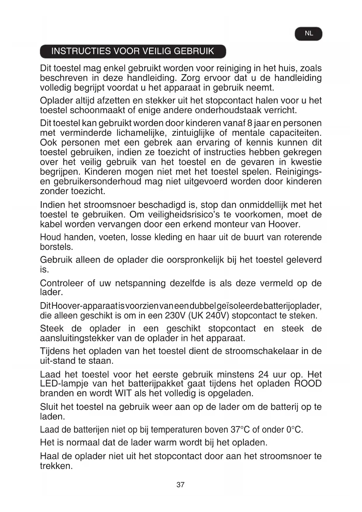 Dit toestel mag enkel gebruikt worden voor reiniging in het huis, zoals beschreven in deze handleiding. Zorg ervoor dat u de handleiding volledig begrijpt voordat u het apparaat in gebruik neemt. Oplader altijd afzetten en stekker uit het stopcontact halen voor u het toestel schoonmaakt of enige andere onderhoudstaak verricht. Dit toestel kan gebruikt worden door kinderen vanaf 8 jaar en personen met verminderde lichamelijke, zintuiglijke of mentale capaciteiten. Ook personen met een gebrek aan ervaring of kennis kunnen dit toestel gebruiken, indien ze toezicht of instructies hebben gekregen over het veilig gebruik van het toestel en de gevaren in kwestie begrijpen. Kinderen mogen niet met het toestel spelen. Reinigings- en gebruikersonderhoud mag niet uitgevoerd worden door kinderen zonder toezicht. Indien het stroomsnoer beschadigd is, stop dan onmiddellijk met het toestel te gebruiken. Om veiligheidsrisico’s te voorkomen, moet de kabel worden vervangen door een erkend monteur van Hoover. Houd handen, voeten, losse kleding en haar uit de buurt van roterende borstels. Gebruik alleen de oplader die oorspronkelijk bij het toestel geleverd is. Controleer of uw netspanning dezelfde is als deze vermeld op de lader. Dit Hoover-apparaat is voorzien van een dubbel geïsoleerde batterijoplader, die alleen geschikt is om in een 230V (UK 240V) stopcontact te steken. Steek de oplader in een geschikt stopcontact en steek de aansluitingstekker van de oplader in het apparaat. Tijdens het opladen van het toestel dient de stroomschakelaar in de uit-stand te staan. Laad het toestel voor het eerste gebruik minstens 24 uur op. Het LED-lampje van het batterijpakket gaat tijdens het opladen ROOD branden en wordt WIT als het volledig is opgeladen. Sluit het toestel na gebruik weer aan op de lader om de batterij op te laden. Laad de batterijen niet op bij temperaturen boven 37°C of onder 0°C. Het is normaal dat de lader warm wordt bij het opladen. Haal de oplader niet uit het stopcontact door aan het stroomsnoer te trekken. NL38 Haal bij langere afwezigheid (vakanties, etc.) de oplader uit het stopcontact. Laad het product opnieuw op voor gebruik, aangezien batterijen uit zichzelf kunnen ontladen tijdens langere opslagperiodes. In het geval dat u het apparaat weg doet, dienen de batterijen eerst verwijderd te worden. Bij het verwijderen van de batterij moet het apparaat ontkoppeld zijn van het net. Gooi de batterijen veilig weg. Laat het apparaat doorwerken totdat het stopt en de batterijen volledig ontladen zijn. Gebruikte batterijen moeten naar een recyclagecentrum gebracht worden en mogen niet bij het huishoudelijk afval weggegooid worden. Om de batterijen te verwijderen neem contact op met de Hoover klantendienst, of ga verder volgens deze instructies. BELANGRIJK: Maak de batterijen helemaal leeg voordat u ze verwijdert. Laat de reiniger draaien totdat de batterijen helemaal leeg zijn. Verwijder de stekker van de oplader uit het toestel. Druk op de ontgrendelingsknoppen van de batterij en schuif deze eruit om te verwijderen. [11] OPMERKING: Mocht u enige problemen ondervinden met het uit elkaar halen van het voorwerp, of voor meer gedetailleerde informatie over behandeling, herstel en recyclage van dit apparaat, neem contact op met uw lokale gemeente of de afvalreinigingsdienst. Gebruik enkel toebehoren, gebruiksartikelen of reserveonderdelen die door Hoover aanbevolen of geleverd worden. Statische elektriciteit: Sommige tapijten kunnen een kleine opbouw van statische elektriciteit veroorzaken. Ontladingen van statische elektriciteit zijn onschadelijk voor uw gezondheid. Gebruik uw toestel nooit buiten, op natte oppervlaktes of op een vochtige ondergrond. Raap geen harde of scherpe objecten op zoals lucifers, hete assen, sigaretten of andere gelijkaardige items. Spuit niet met ontvlambare vloeistoffen, reinigingsvloeistoffen, aerosols of hun dampen en zuig ze ook niet op. Loop niet over het stroomsnoer wanneer u het toestel gebruikt of verwijder de stekker niet door aan het stroomsnoer te trekken. Gebruik uw apparaat of oplader niet als deze defect blijkt te zijn. Hoover service: Om de veilige en doeltreffende werking van het apparaat te verzekeren, adviseren wij om onderhoud of reparaties alleen door een erkende onderhoudsmonteur van Hoover te laten uitvoeren. NLPRODUCTONDERDELEN