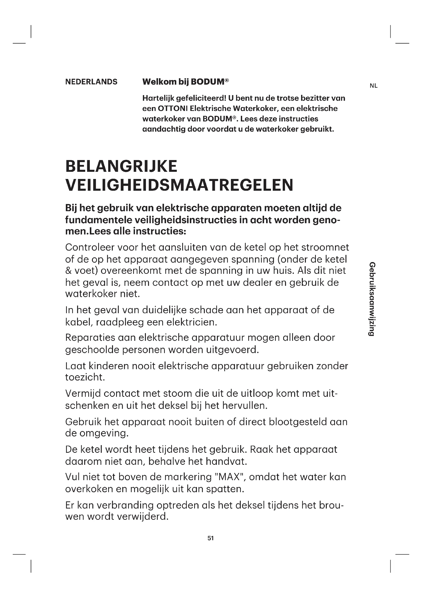 Hartelijk gefeliciteerd! U bent nu de trotse bezitter van een OTTONI Elektrische Waterkoker, een elektrische waterkoker van BODUM. Lees deze instructies aandachtig door voordat u de waterkoker gebruikt.