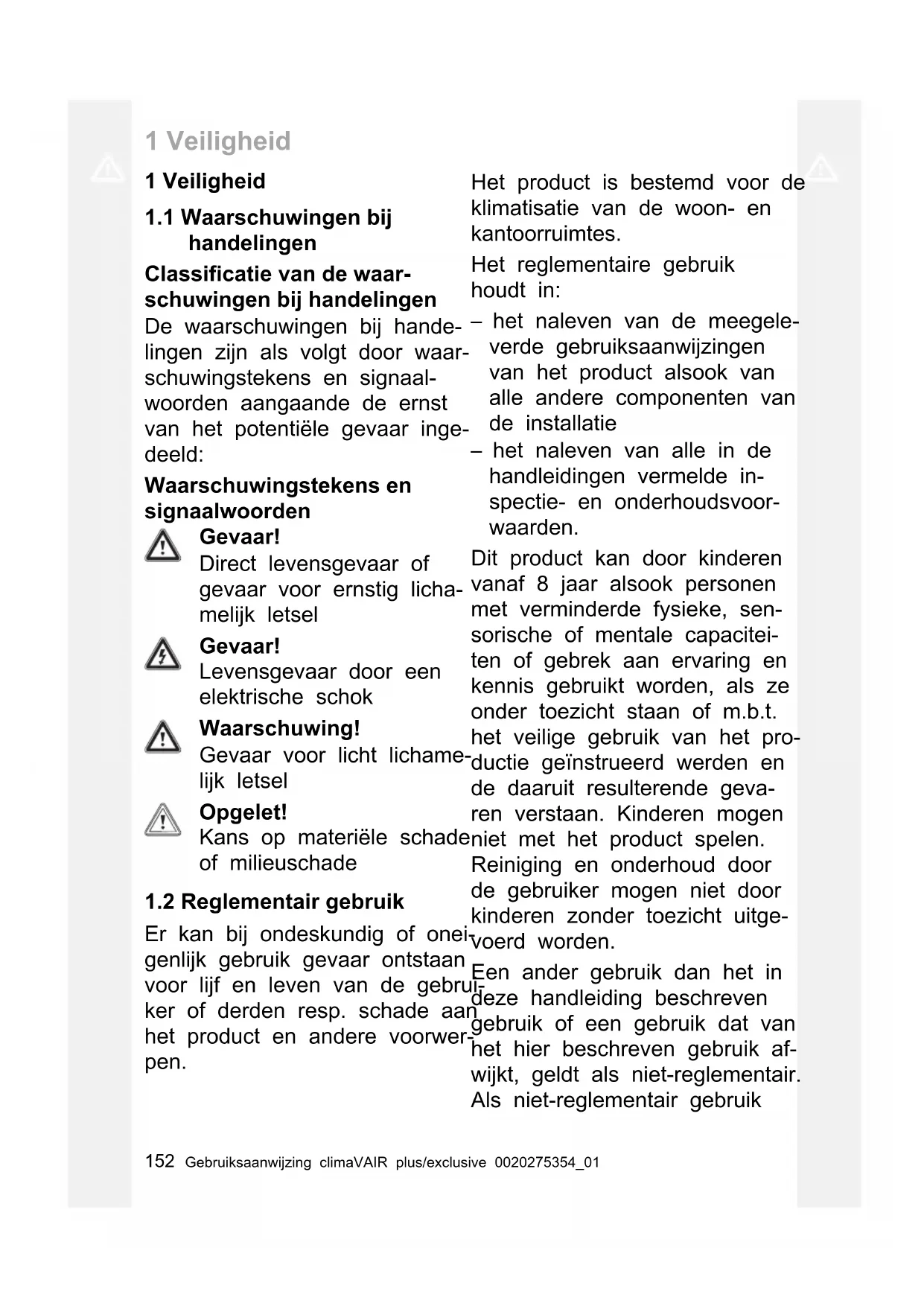 Er kan bij ondeskundig of onei- genlijk gebruik gevaar ontstaan voor lijf en leven van de gebrui- ker of derden resp. schade aan het product en andere voorwer- pen. Het product is bestemd voor de klimatisatie van de woon- en kantoorruimtes. Het reglementaire gebruik houdt in: – het naleven van de meegele- verde gebruiksaanwijzingen van het product alsook van alle andere componenten van de installatie – het naleven van alle in de handleidingen vermelde in- spectie- en onderhoudsvoor- waarden. Dit product kan door kinderen vanaf 8 jaar alsook personen met verminderde fysieke, sen- sorische of mentale capacitei- ten of gebrek aan ervaring en kennis gebruikt worden, als ze onder toezicht staan of m.b.t. het veilige gebruik van het pro- ductie geïnstrueerd werden en de daaruit resulterende geva- ren verstaan. Kinderen mogen niet met het product spelen. Reiniging en onderhoud door de gebruiker mogen niet door kinderen zonder toezicht uitge- voerd worden. Een ander gebruik dan het in deze handleiding beschreven gebruik of een gebruik dat van het hier beschreven gebruik af- wijkt, geldt als niet-reglementair. Als niet-reglementair gebruikVeiligheid 1 0020275354_01 climaVAIR plus/exclusive Gebruiksaanwijzing 153 geldt ook ieder direct commer- cieel of industrieel gebruik. Elke gebruik voor het bewaren van voedingsmiddelen, planten of andere licht bederfelijke levens- middelen wordt eveneens als niet reglementair beschouwd. Attentie! Ieder misbruik is verboden.