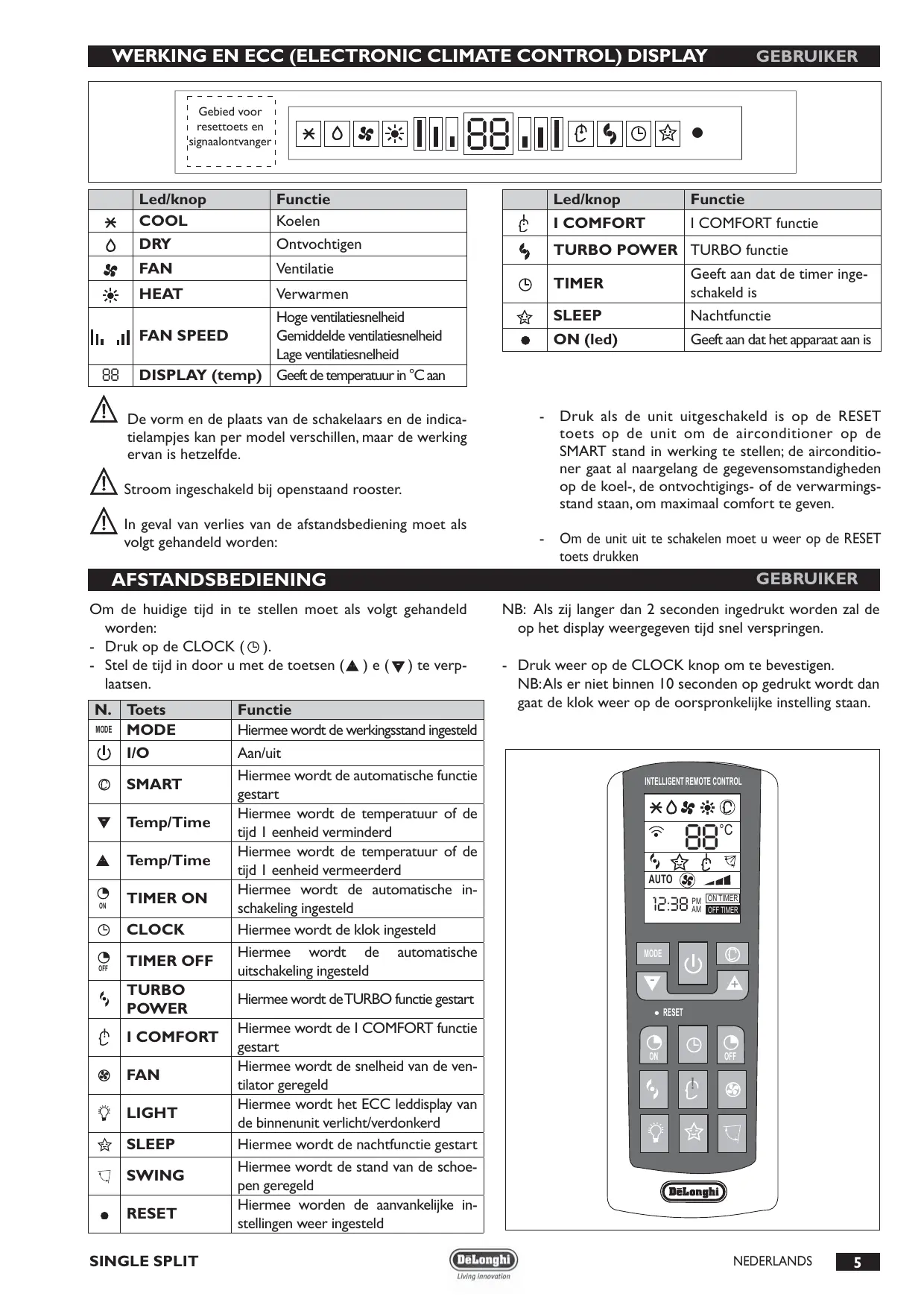 DEUTSCH SINGLE SPLIT Geachte klant, Wij danken u hartelijk dat u de voorkeur gegeven heeft aan een airconditioner , een innovatief en kwaliteitsproduct, dat u van absolute behaaglijkheid zal verzekeren. Deze gebruiksaanwijzing bevat belangrijke aanwijzingen en suggesties die wij u verzoeken in acht te nemen om uw airconditioner op de meest geschikte manier te gebruiken. Wij danken u nogmaals hartelijk. De’Longhi Group De uiterlijke en maatvoeringskenmerken, de technische gegevens en de accessoires van dit apparaat kunnen zonder voorafgaande kennisgeving gewijzigd worden in verband met het continu streven naar verbeteringen door het bedrijf.