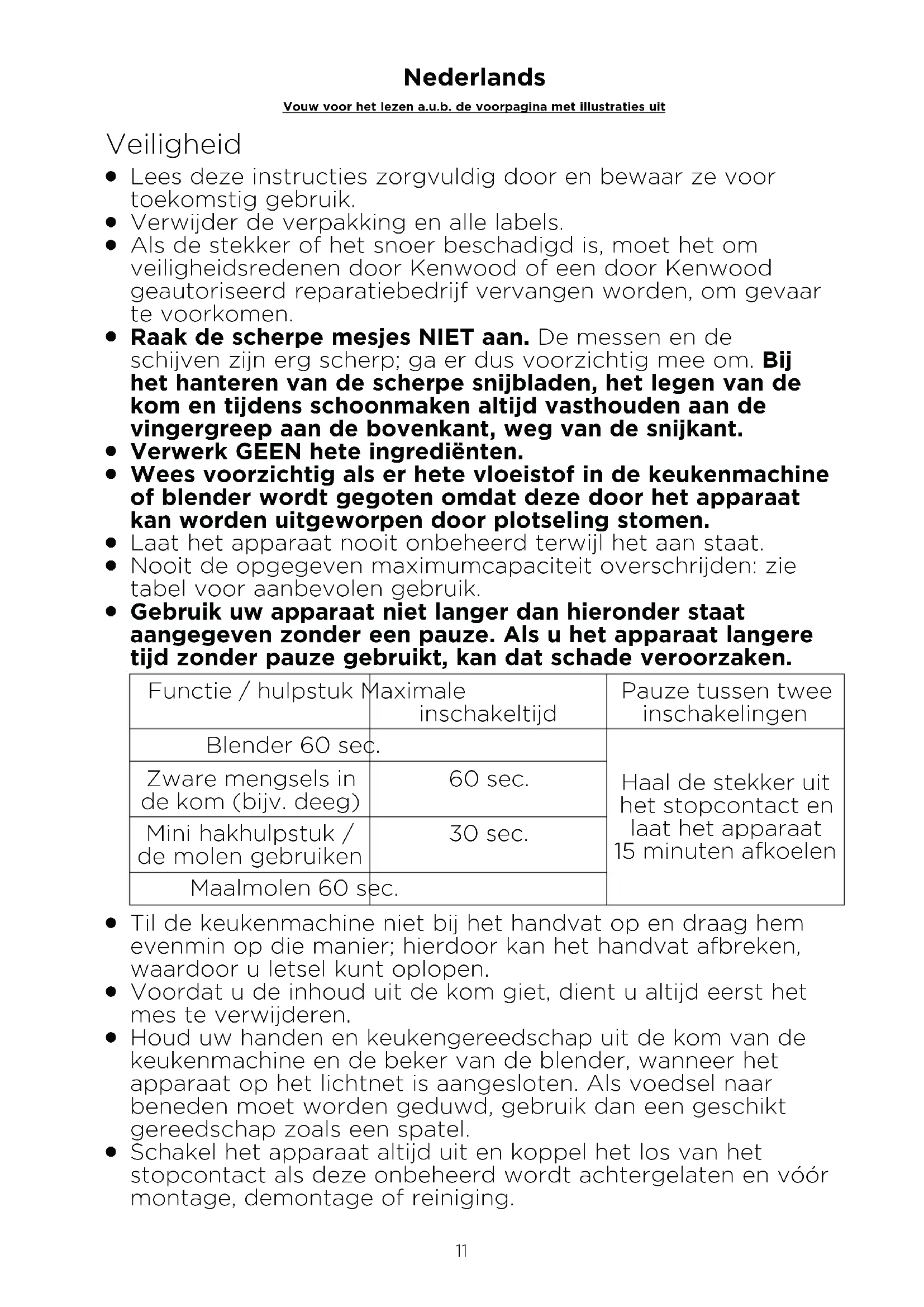 Gebruik uw apparaat niet langer dan hieronder staat aangegeven zonder een pauze. Als u het apparaat langere tijd zonder pauze gebruikt, kan dat schade veroorzaken. Functie / hulpstuk Maximale inschakeltijd Pauze tussen twee inschakelingen Blender 60 sec. Haal de stekker uit het stopcontact en laat het apparaat 15 minuten afkoelen Zware mengsels in de kom (bijv. deeg) 60 sec. Mini hakhulpstuk / de molen gebruiken 30 sec. Maalmolen 60 sec.