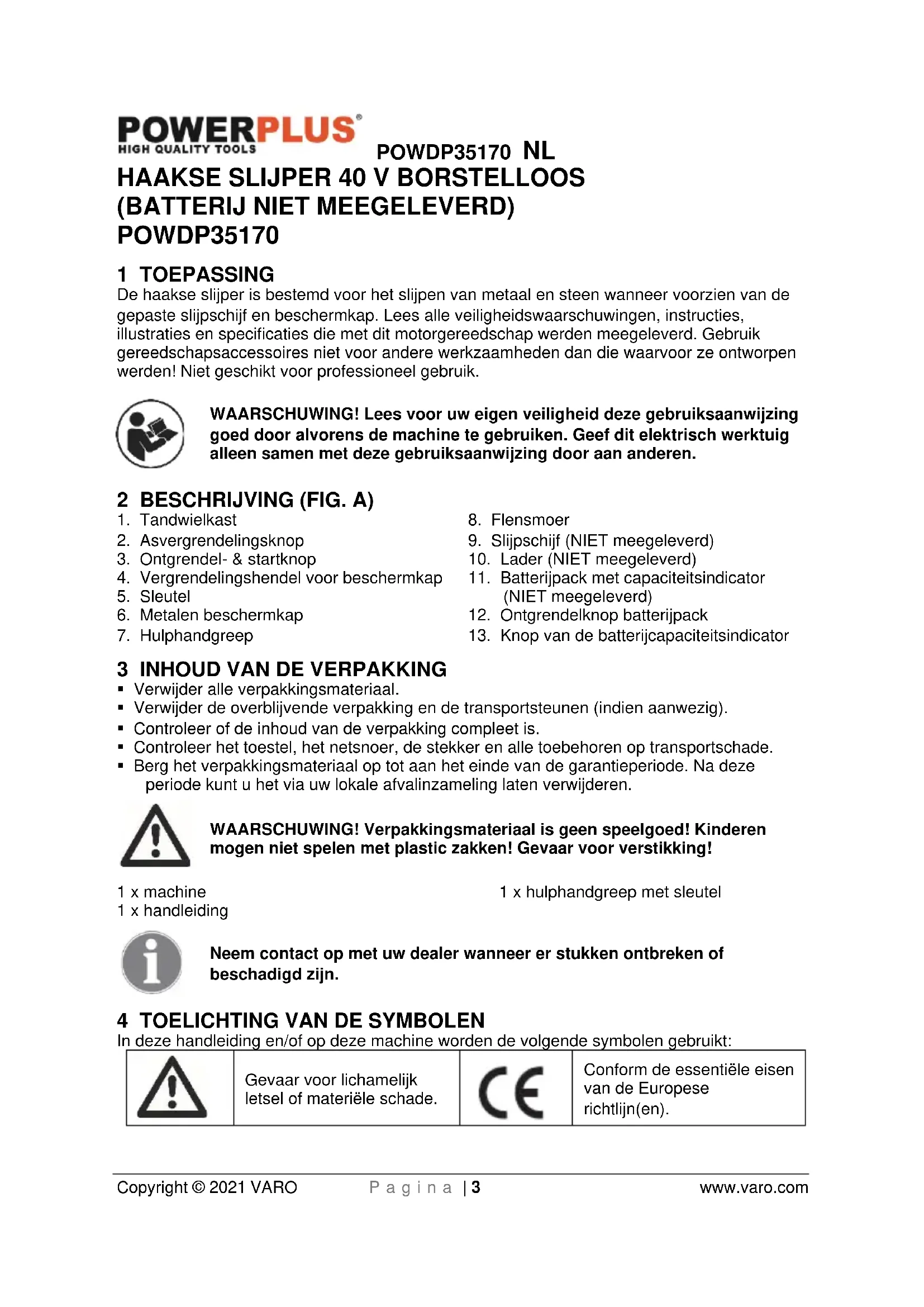 - Uw toestel moet minstens 1x per maand opgeladen worden, opdat de werking van dit toestel optimaal blijft. 16 MILIEU Indien u, na zekere tijd, beslist uw machine te vervangen, werp deze dan niet weg bij uw huishoudelijk afval maar doe dit op een milieuvriendelijke wijze. Afval geproduceerd door elektrische machines mag niet op dezelfde manier behandeld worden als het gewone huishoudelijke afval. Breng het naar een recyclagecentrum op plaatsen waar zulke gepaste installaties bestaan. Raadpleeg de plaatselijke instanties of de verkoper voor adviezen over inzameling en verwerking.POWDP35170 NL Copyright © 2021 VARO P a g i n a | 14 www.varo.com 17 CONFORMITEITSVERKLARING VARO – Vic. Van Rompuy N.V. - Joseph Van Instraat 9 - BE2500 Lier - BELGIUM, verklaart dat, Product: HAAKSE SLIJPER 20 V - Batterijgevoed Handelsmerk: PowerPlus Model: POWDP35170 voldoet aan de essentiële eisen en aan de overige relevante bepalingen van de van toepassing zijnde Europese Richtlijnen, gebaseerd op de toepassing van Europese geharmoniseerde normen. Elke niet-toegelaten modificatie van het apparaat maakt deze verklaring nietig. Europese Richtlijnen (inclusief, indien van toepassing, hun wijzigingen tot op de datum van ondertekening): 2011/65/EU 2006/42/EC 2014/30/EU Europese geharmoniseerde normen (inclusief, indien van toepassing, hun wijzigingen tot op de datum van ondertekening): EN60745-1: 2009 EN60745-2-3: 2011 EN55014-1: 2017 EN55014-2: 2015 Beheerder van de technische documentatie: Philippe Vankerkhove, VARO – Vic. Van Rompuy N.V. Ondergetekende handelt in opdracht van de bedrijfsleider, Ludo Mertens Regelgevings- en compliancemanager 06/10/2020, Lier - BelgiumPOWDP35170 FR Copyright © 2021 VARO P a g e | 1 www.varo.com 1 UTILISATION .................................................................................. 3