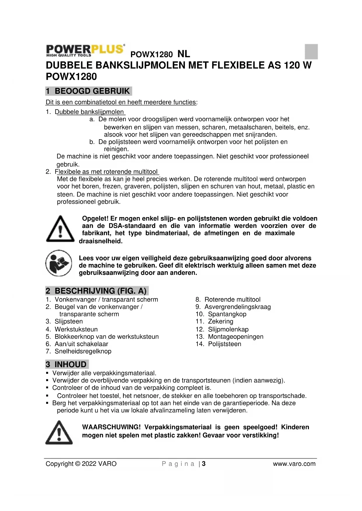 - Gebruik: Slijpen, ontbramen, roest verwijderen, vormgeven.POWX1280 NL Copyright © 2022 VARO P a g i n a | 10 www.varo.com