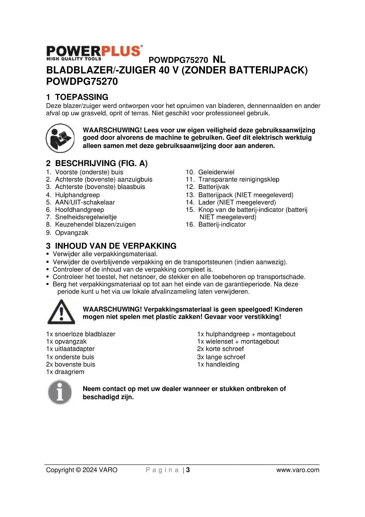 - Berg het verpakkingsmateriaal op tot aan het einde van de garantieperiode. Na deze periode kunt u het via uw lokale afvalinzameling laten verwijderen. WAARSCHUWING! Verpakkingsmateriaal is geen speelgoed! Kinderen mogen niet spelen met plastic zakken! Gevaar voor verstikking! 1x snoerloze bladblazer 1x opvangzak 1x uitlaatadapter 1x onderste buis 2x bovenste buis 1x draagriem 1x hulphandgreep + montagebout 1x wielenset + montagebout 2x korte schroef 3x lange schroef 1x handleiding Neem contact op met uw dealer wanneer er stukken ontbreken of beschadigd zijn.POWDPG75270 NL Copyright © 2024 VARO P a g i n a | 4 www.varo.com