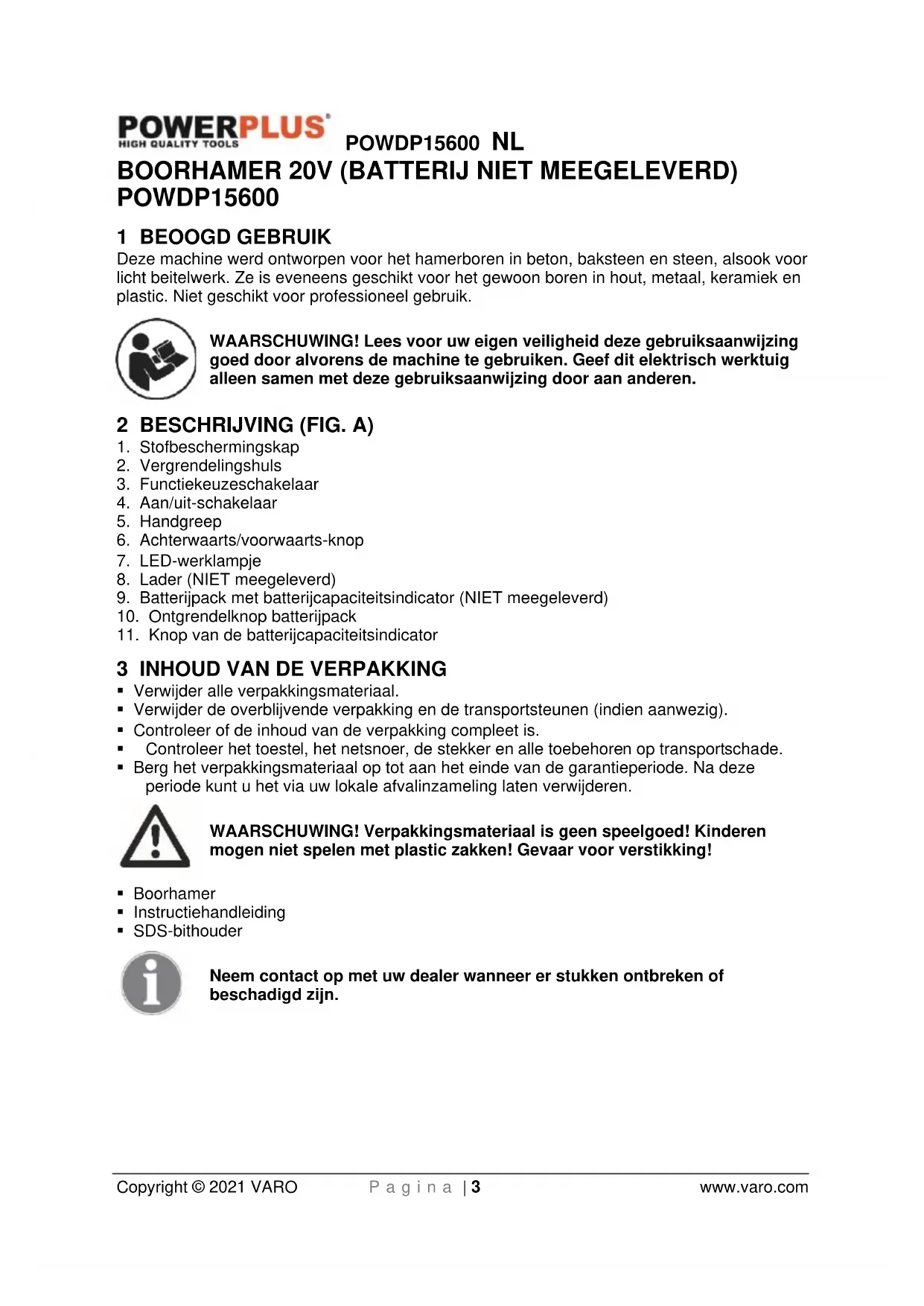 - SDS-bithouder Neem contact op met uw dealer wanneer er stukken ontbreken of beschadigd zijn.POWDP15600 NL Copyright © 2021 VARO P a g i n a | 4 www.varo.com