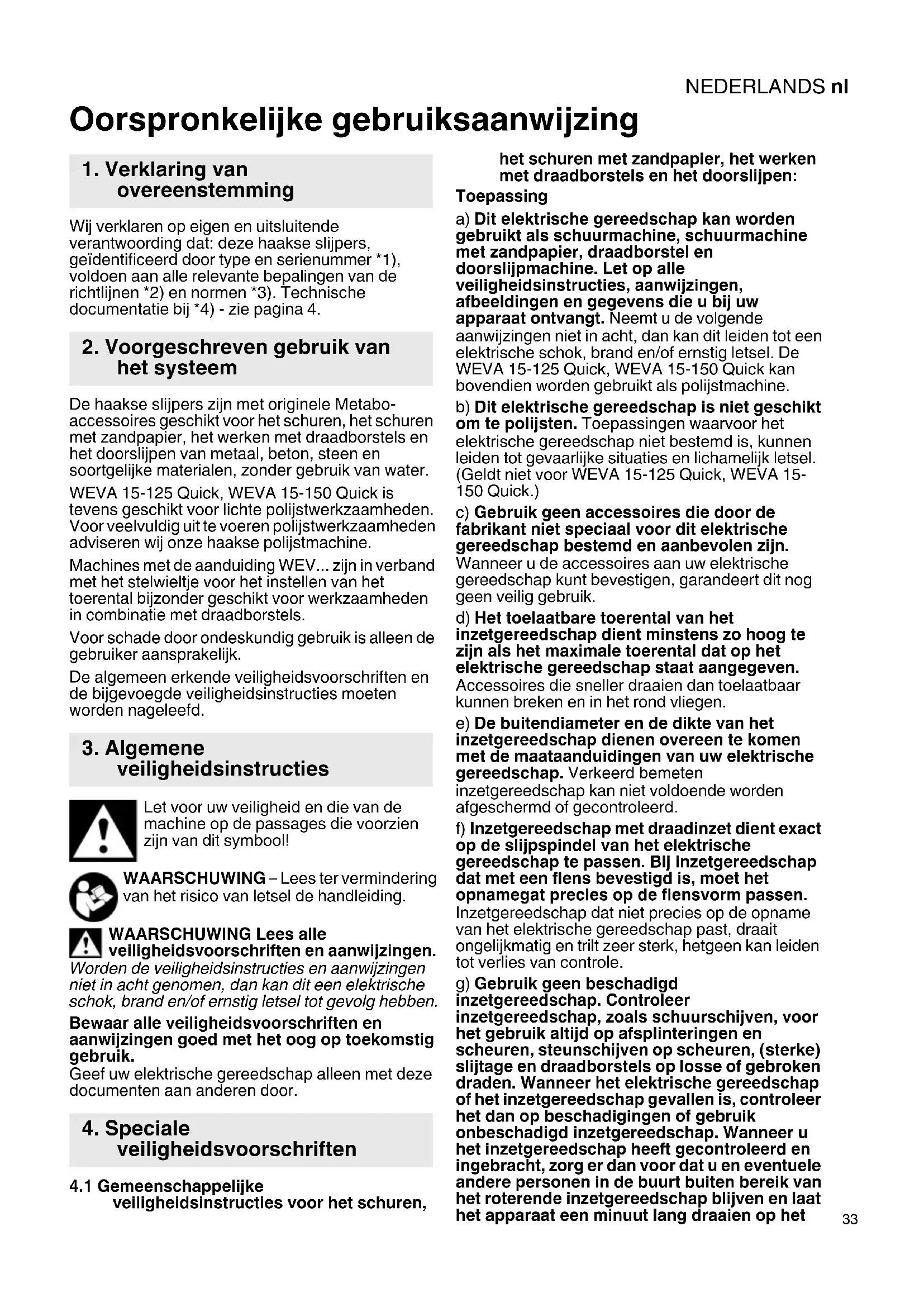 Oorspronkelijke gebruiksaanwijzing Wij verklaren op eigen en uitsluitende verantwoording dat: deze haakse slijpers, geïdentificeerd door type en serienummer *1), voldoen aan alle relevante bepalingen van de richtlijnen *2) en normen *3). Technische documentatie bij *4) - zie pagina 4. De haakse slijpers zijn met originele Metabo- accessoires geschikt voor het schuren, het schuren met zandpapier, het werken met draadborstels en het doorslijpen van metaal, beton, steen en soortgelijke materialen, zonder gebruik van water. WEVA 15-125 Quick, WEVA 15-150 Quick is tevens geschikt voor lichte polijstwerkzaamheden. Voor veelvuldig uit te voeren polijstwerkzaamheden adviseren wij onze haakse polijstmachine. Machines met de aanduiding WEV... zijn in verband met het stelwieltje voor het instellen van het toerental bijzonder geschikt voor werkzaamheden in combinatie met draadborstels. Voor schade door ondeskundig gebruik is alleen de gebruiker aansprakelijk. De algemeen erkende veiligheidsvoorschriften en de bijgevoegde veiligheidsinstructies moeten worden nageleefd. Let voor uw veiligheid en die van de machine op de passages die voorzien zijn van dit symbool! WAARSCHUWING – Lees ter vermindering van het risico van letsel de handleiding. WAARSCHUWING Lees alle veiligheidsvoorschriften en aanwijzingen. Worden de veiligheidsinstructies en aanwijzingen niet in acht genomen, dan kan dit een elektrische schok, brand en/of ernstig letsel tot gevolg hebben. Bewaar alle veiligheidsvoorschriften en aanwijzingen goed met het oog op toekomstig gebruik. Geef uw elektrische gereedschap alleen met deze documenten aan anderen door.