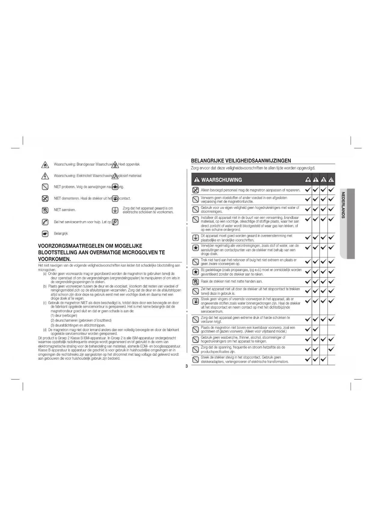 VOORKOMEN. Het niet navolgen van de volgende veiligheidsvoorschriften kan leiden tot schadelijke blootstelling aan microgolven. (a) Onder geen voorwaarde mag er geprobeerd worden de magnetron te gebruiken terwijl de deur openstaat of om de vergrendelingen (vergrendelingspallen) te manipuleren of om iets in de vergrendelingsopeningen te steken. (b) Plaats geen voorwerpen tussen de deur en de voorplaat. Voorkom dat resten van voedsel of reinigingsmiddel zich op de afsluitstrippen verzamelen. Zorg dat de deur en de afsluitstrippen altijd schoon zijn door deze na gebruik eerst met een vochtige doek en daarna met een droge doek af te vegen. (c) Gebruik de magnetron NIET als deze beschadigd is, totdat deze door een bevoegde en door de fabrikant opgeleide servicemonteur is gerepareerd. Het is met name belangrijk dat de magnetrondeur goed sluit en dat er geen schade is aan de: (1) deur (verbogen) (2) deurscharnieren (gebroken of loszittend) (3) deurafdichtingen en afdichtstrippen. (d) De magnetron mag niet door iemand anders dan een volledig bevoegde en door de fabrikant opgeleide servicemonteur worden gerepareerd. Dit product is Groep 2 Klasse B ISM-apparatuur. In Groep 2 is alle ISM-apparatuur ondergebracht waarmee opzettelijk radiofrequente energie wordt gegenereerd en/of gebruikt in de vorm van elektromagnetische straling voor de behandeling van materiaal, alsmede EDM- en booglasapparatuur. Klasse B-apparatuur is apparatuur die geschikt is voor gebruik in huishoudelijke omgevingen en in omgevingen die rechtstreeks zijn aangesloten op het stroomnet met laag voltage dat geleverd wordt aan gebouwen die voor huishoudelijk gebruik zijn bedoeld.