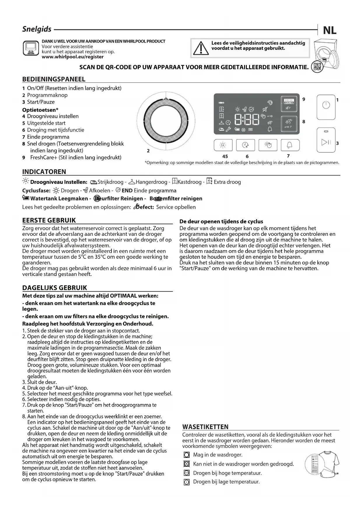 Lees de veiligheidsinstructies aandachtig voordat u het apparaat gebruikt. SCAN DE QR-CODE OP UW APPARAAT VOOR MEER GEDETAILLEERDE INFORMATIE. Snelgids DAGELIJKS GEBRUIK Met deze tips zal uw machine altijd OPTIMAAL werken: - denk eraan om het watertank na elke droogcyclus te legen. - denk eraan om uw lters na elke droogcyclus te reinigen. Raadpleeg het hoofdstuk Verzorging en Onderhoud.