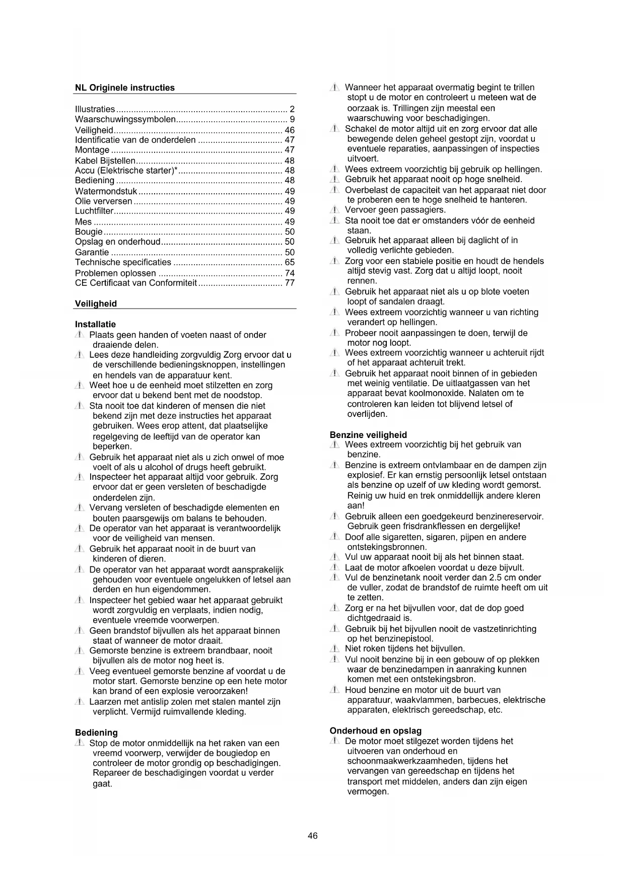 - CE Certificaat van Conformiteit Veiligheid Installatie Plaats geen handen of voeten naast of onder draaiende delen. Lees deze handleiding zorgvuldig Zorg ervoor dat u de verschillende bedieningsknoppen, instellingen en hendels van de apparatuur kent. Weet hoe u de eenheid moet stilzetten en zorg ervoor dat u bekend bent met de noodstop. Sta nooit toe dat kinderen of mensen die niet bekend zijn met deze instructies het apparaat gebruiken. Wees erop attent, dat plaatselijke regelgeving de leeftijd van de operator kan beperken. Gebruik het apparaat niet als u zich onwel of moe voelt of als u alcohol of drugs heeft gebruikt. Inspecteer het apparaat altijd voor gebruik. Zorg ervoor dat er geen versleten of beschadigde onderdelen zijn. Vervang versleten of beschadigde elementen en bouten paarsgewijs om balans te behouden. De operator van het apparaat is verantwoordelijk voor de veiligheid van mensen. Gebruik het apparaat nooit in de buurt van kinderen of dieren. De operator van het apparaat wordt aansprakelijk gehouden voor eventuele ongelukken of letsel aan derden en hun eigendommen. Inspecteer het gebied waar het apparaat gebruikt wordt zorgvuldig en verplaats, indien nodig, eventuele vreemde voorwerpen. Geen brandstof bijvullen als het apparaat binnen staat of wanneer de motor draait. Gemorste benzine is extreem brandbaar, nooit bijvullen als de motor nog heet is. Veeg eventueel gemorste benzine af voordat u de motor start. Gemorste benzine op een hete motor kan brand of een explosie veroorzaken! Laarzen met antislip zolen met stalen mantel zijn verplicht. Vermijd ruimvallende kleding. Bediening Stop de motor onmiddellijk na het raken van een vreemd voorwerp, verwijder de bougiedop en controleer de motor grondig op beschadigingen. Repareer de beschadigingen voordat u verder gaat. Wanneer het apparaat overmatig begint te trillen stopt u de motor en controleert u meteen wat de oorzaak is. Trillingen zijn meestal een waarschuwing voor beschadigingen. Schakel de motor altijd uit en zorg ervoor dat alle bewegende delen geheel gestopt zijn, voordat u eventuele reparaties, aanpassingen of inspecties uitvoert. Wees extreem voorzichtig bij gebruik op hellingen. Gebruik het apparaat nooit op hoge snelheid. Overbelast de capaciteit van het apparaat niet door te proberen een te hoge snelheid te hanteren. Vervoer geen passagiers. Sta nooit toe dat er omstanders vóór de eenheid staan. Gebruik het apparaat alleen bij daglicht of in volledig verlichte gebieden. Zorg voor een stabiele positie en houdt de hendels altijd stevig vast. Zorg dat u altijd loopt, nooit rennen. Gebruik het apparaat niet als u op blote voeten loopt of sandalen draagt. Wees extreem voorzichtig wanneer u van richting verandert op hellingen. Probeer nooit aanpassingen te doen, terwijl de motor nog loopt. Wees extreem voorzichtig wanneer u achteruit rijdt of het apparaat achteruit trekt. Gebruik het apparaat nooit binnen of in gebieden met weinig ventilatie. De uitlaatgassen van het apparaat bevat koolmonoxide. Nalaten om te controleren kan leiden tot blijvend letsel of overlijden. Benzine veiligheid Wees extreem voorzichtig bij het gebruik van benzine. Benzine is extreem ontvlambaar en de dampen zijn explosief. Er kan ernstig persoonlijk letsel ontstaan als benzine op uzelf of uw kleding wordt gemorst. Reinig uw huid en trek onmiddellijk andere kleren aan! Gebruik alleen een goedgekeurd benzinereservoir. Gebruik geen frisdrankflessen en dergelijke! Doof alle sigaretten, sigaren, pijpen en andere ontstekingsbronnen. Vul uw apparaat nooit bij als het binnen staat. Laat de motor afkoelen voordat u deze bijvult. Vul de benzinetank nooit verder dan 2.5 cm onder de vuller, zodat de brandstof de ruimte heeft om uit te zetten. Zorg er na het bijvullen voor, dat de dop goed dichtgedraaid is. Gebruik bij het bijvullen nooit de vastzetinrichting op het benzinepistool. Niet roken tijdens het bijvullen. Vul nooit benzine bij in een gebouw of op plekken waar de benzinedampen in aanraking kunnen komen met een ontstekingsbron. Houd benzine en motor uit de buurt van apparatuur, waakvlammen, barbecues, elektrische apparaten, elektrisch gereedschap, etc. Onderhoud en opslag De motor moet stilgezet worden tijdens het uitvoeren van onderhoud en schoonmaakwerkzaamheden, tijdens het vervangen van gereedschap en tijdens het transport met middelen, anders dan zijn eigen vermogen.47 Controleer regelmatig of alle bouten en moeren goed vastzitten. Draai deze zo nodig vast. De motor moet compleet afgekoeld zijn, voordat u het apparaat binnen in de stalling zet of afdekt. Wanneer het apparaat enige tijd niet gebruikt is, leest u dan de instructies in deze handleiding. Bewaar of vervang zo nodig veiligheids- en instructielabels. Gebruik alleen originele reserveonderdelen of accessoires. Wanneer geen originele onderdelen of accessoires worden gebruikt, vervalt de aansprakelijkheid. Overig De motor wordt niet gevuld met olie geleverd. Controleer voor het starten altijd het oliepeil. In de fabriek gemonteerde besturingsapparaten, zoals de op een hendel bevestigde koppelingskabel, mogen niet verwijderd of blootgesteld worden. Laat de benzinetank alleen in de buitenlucht leeglopen. Benzine is extreem ontvlambaar en de dampen zijn explosief. Zorg ervoor dat het apparaat goed is vastgezet tijdens het transport op een open laadbak etc. p. 77